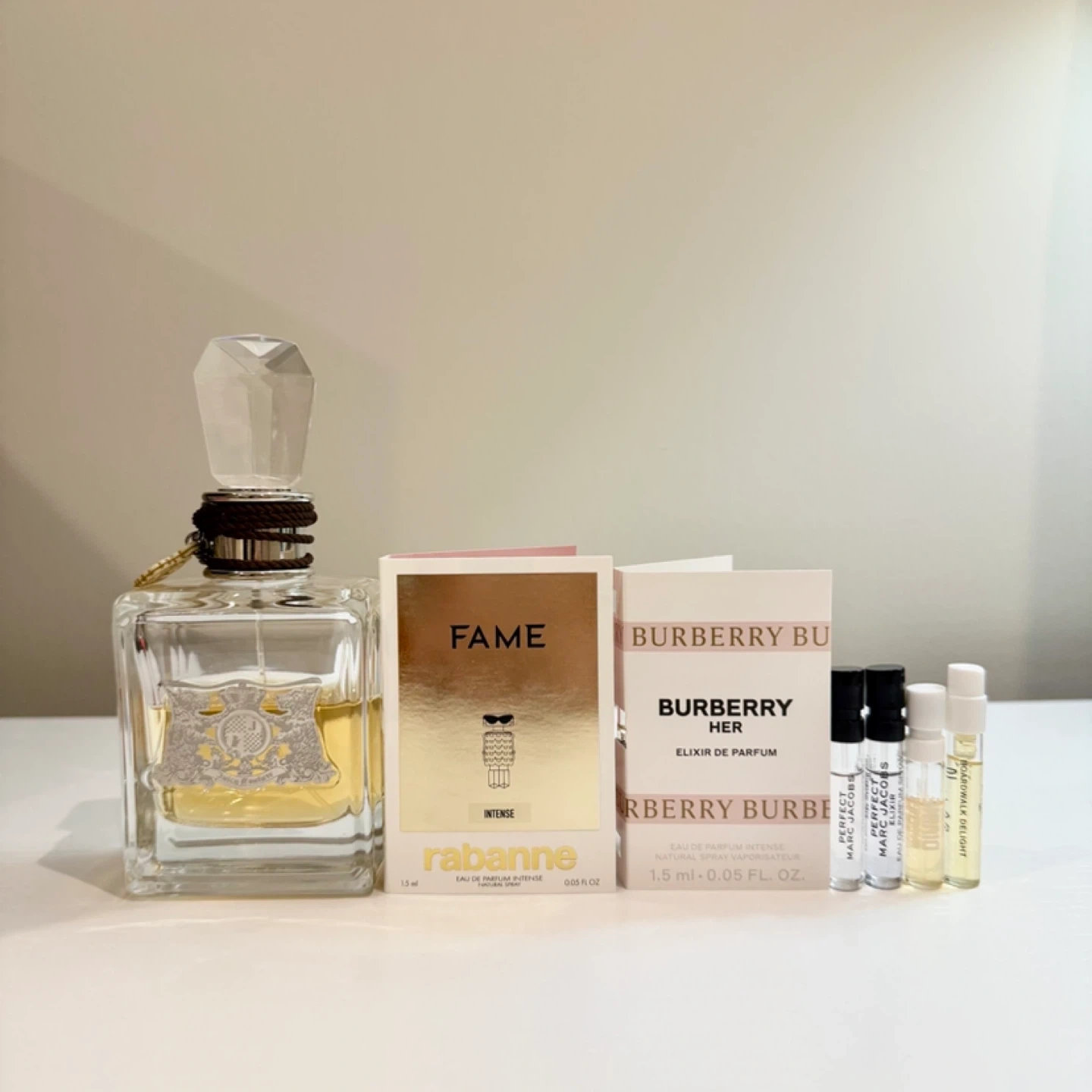 The theme of this bundle is anchored on Juicy Couture Eau de Couture. Vibe: Fun, bold, and flirty — for the one who turns heads and owns her sparkle. Supporting Minis: • Paco Rabanne Fame Intense – fruity-floral confidence with a sleek, modern edge. • Burberry Her – juicy berries and musk for youthful sparkle. • Marc Jacobs Perfect – uplifting floral-fruity sweetness with carefree charm. • Marc Jacobs Perfect Elixir – deeper, creamier floral warmth that adds sophistication. • Jean Paul Gaultier Divine – luminous white florals and creamy warmth for bold, feminine radiance. • Skylar Boardwalk Delight – cotton-candy vanilla fun for an extra playful summer twist. FAQs: • Is the price for everything shown? Yes — the listed price includes the entire bundle, featuring the full-size Juicy Couture Eau de Couture and all the included minis. • What’s the condition of the main bottle? This 100mL Juicy Couture bottle is beautifully maintained and approximately half full (around 55% remaining). The exact perfume level is shown in the photos for reference. • What are the minis? Each mini is a sample-sized perfume curated to match the confident, playful, and glam vibe of this bundle — bright fruits, creamy florals, and irresistible sweetness that capture true It-Girl energy.