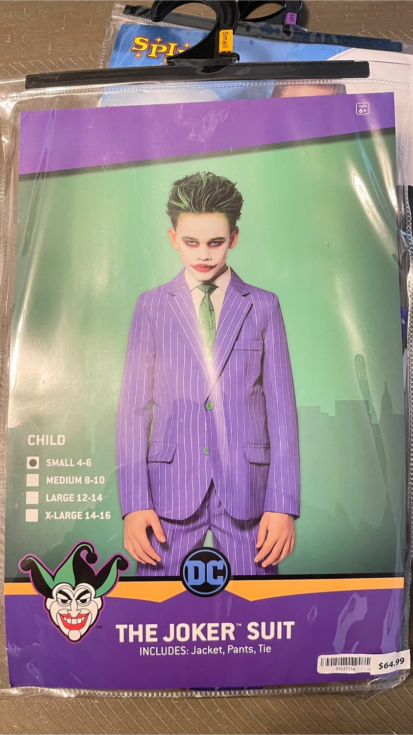 I'm selling a like brand new The Joker Suit for kids! It's a size small..The suit includes the jacket, pants, and tie. Originally bought for $64.99 Only used once last year,i think my husband still have the receipt Pick up Vancouver or Langley