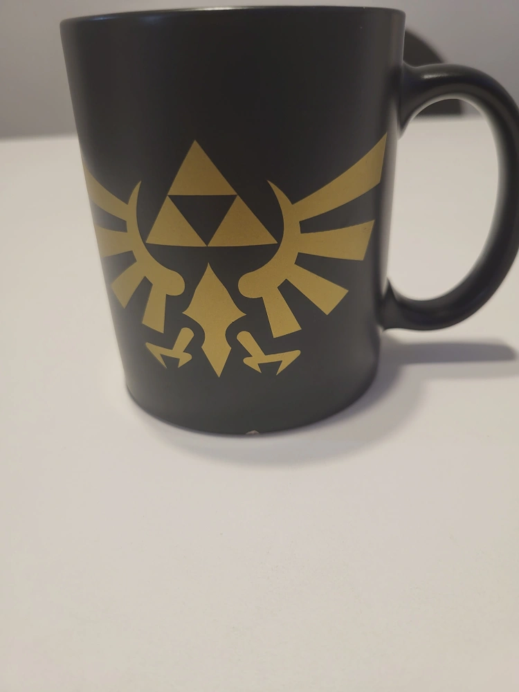 Selling a black mug featuring The Legend of Zelda logo. It's in great condition and ready for a new home! Perfect for any Zelda fan to enjoy their morning coffee or tea