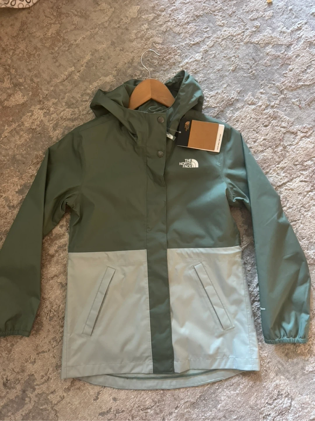 Selling a The North Face girls' jacket, size M (10/12). It's BRAND NEW with tags and features DryVent technology. The colour is Laurel Wreath/Tarn