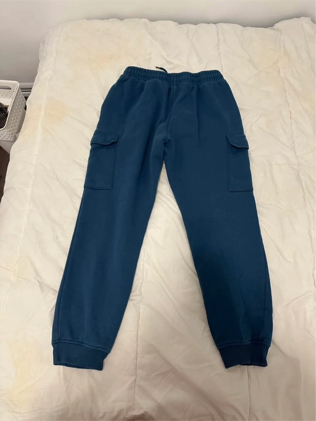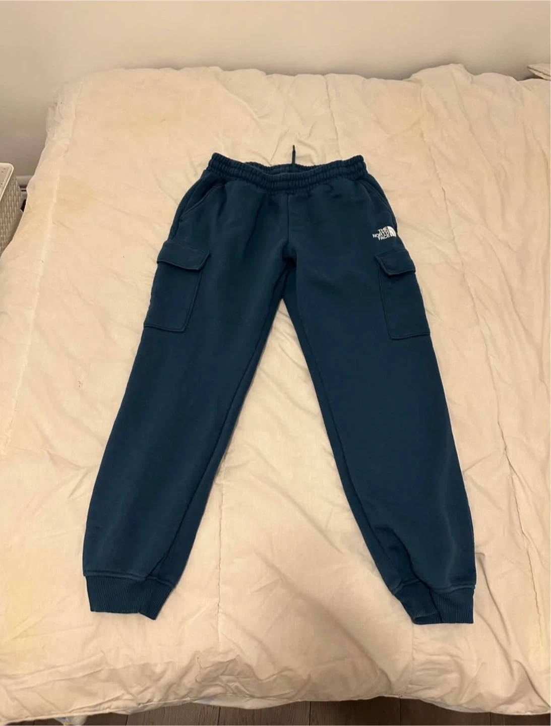 Selling a pair of The North Face cargo sweatpants. They are a nice blue colour and have a comfortable fit. They're perfect for lounging or running errands around town!