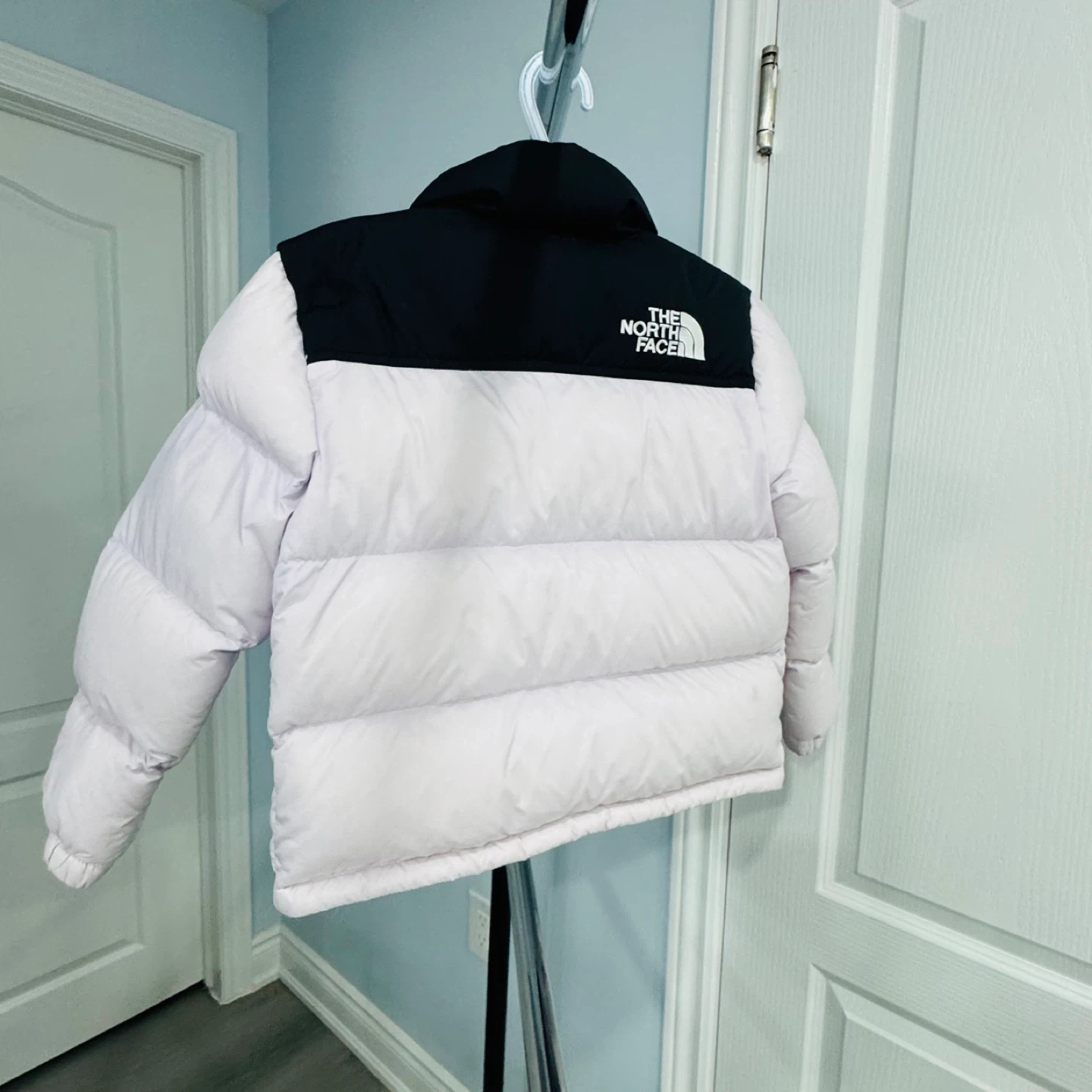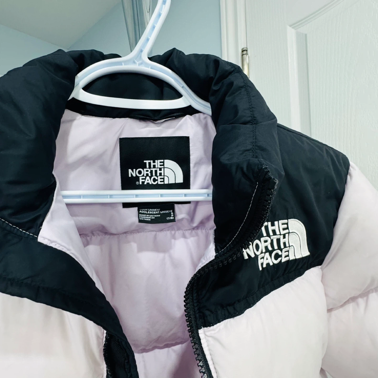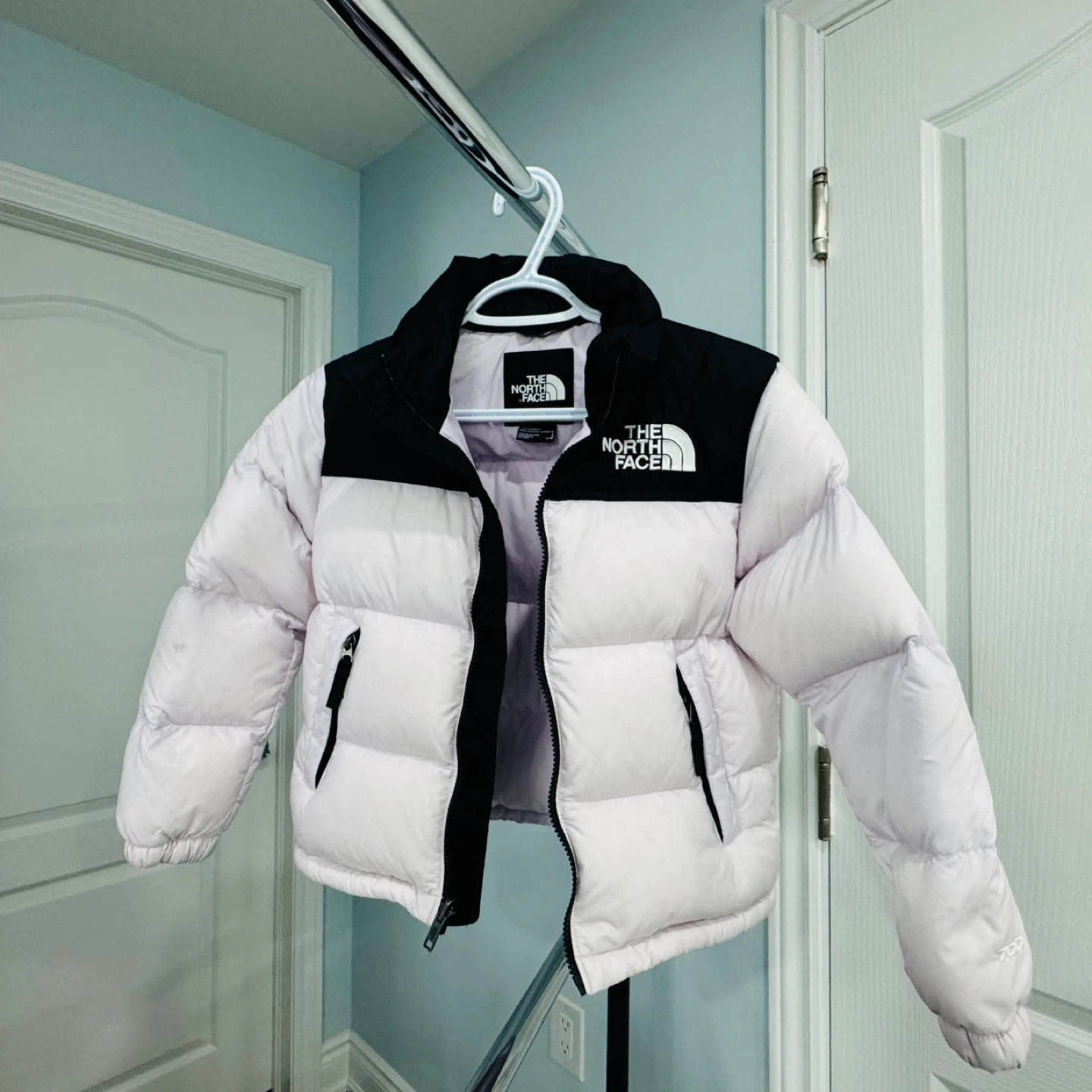 Selling a gently used The North Face kids' puffer jacket! It's a stylish light pink and black colour block design. Size is S/P, 7/8.
