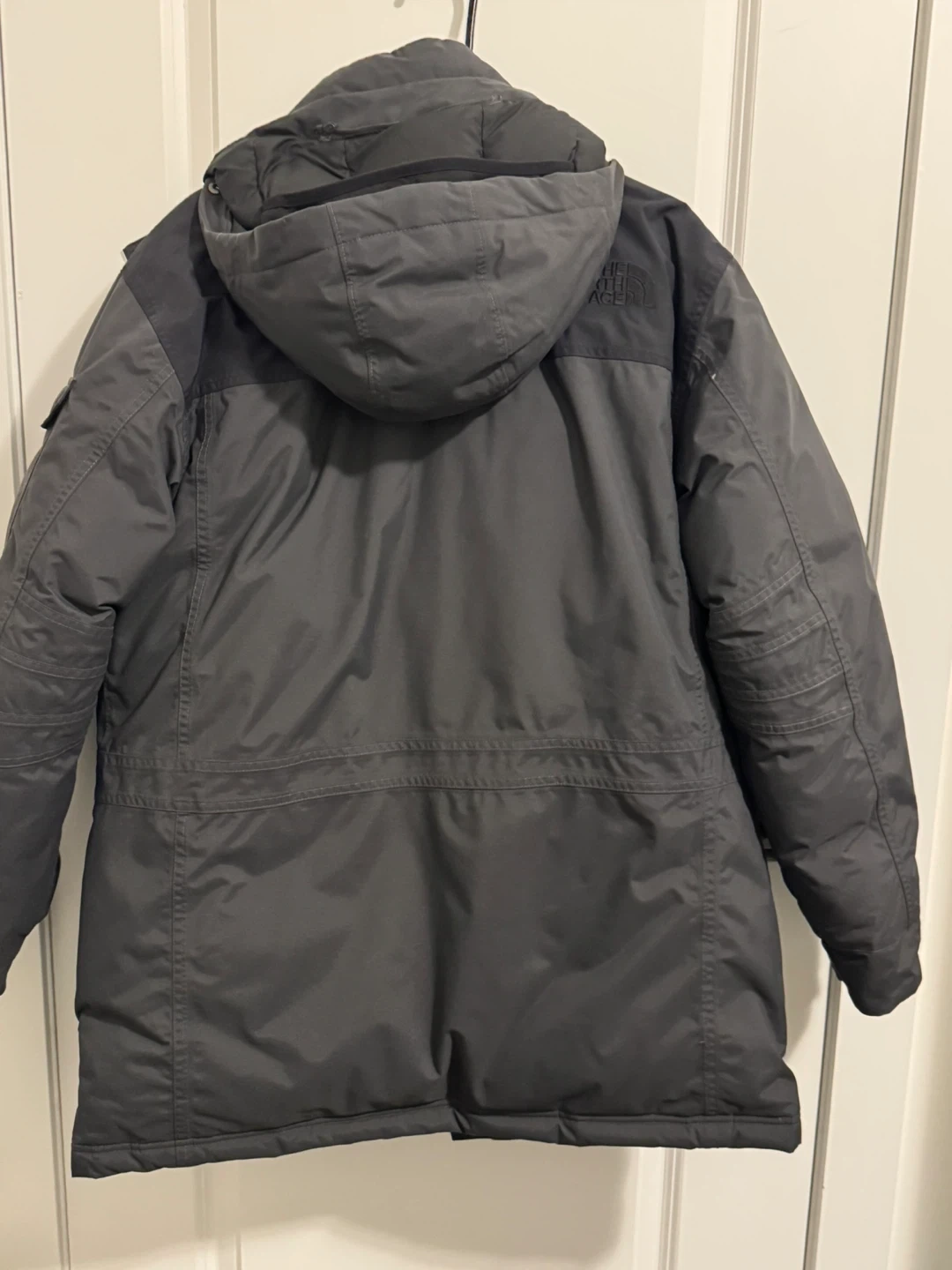Selling a The North Face parka in men's size medium. It's a great jacket for the cold Canadian winters. It has a hood and lots of pockets!