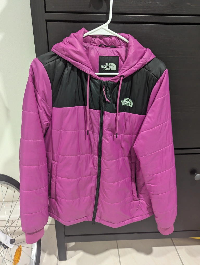 Deep Mulberry/ Pink puffer jacket with black accents. Perfect for you, in case you are looking for a lightweight winter jacket. Can sustain till approximately -5° Celsius. Beautiful color! Out of stock in stores, retails at approximately 159+tax.