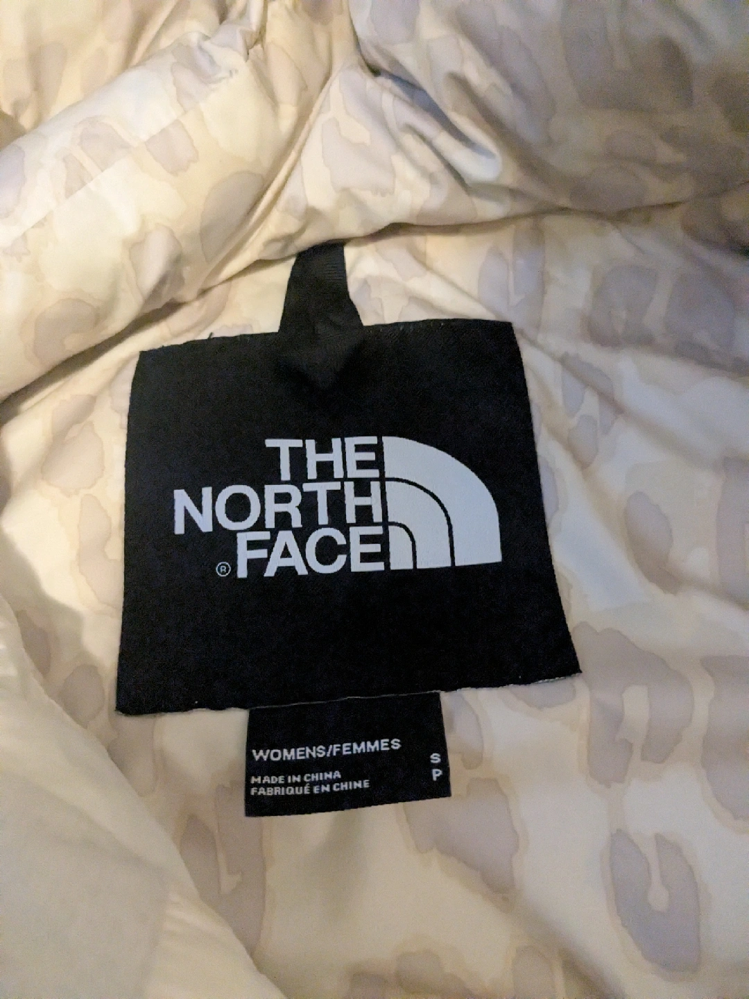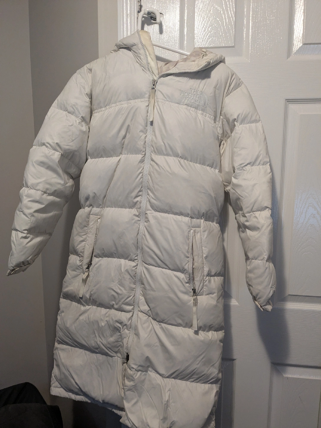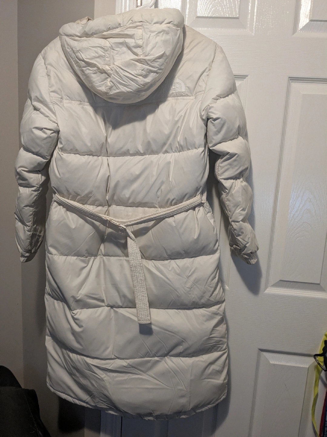 Selling a lovely white puffer coat from The North Face. It's in great condition and ready to keep you warm! The coat features a belt and a hood. Perfect for the cold weather. Pet free and no exposure to smoke
