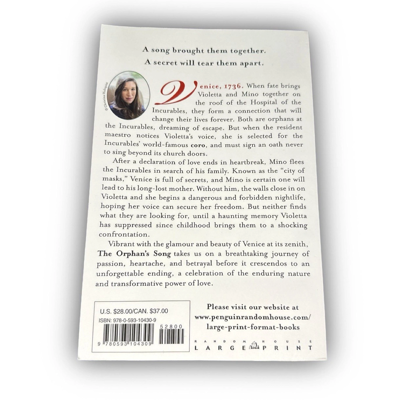 Paperback, Like-New, 336 pages By: Lauren Kate Publisher: Putnam Adult (Hc) (June 25 2019) In Coming of Age Fiction, Historical Romance, Historical Fiction Description: Venice, 1736. Violetta has a secret: When she climbs out of her window at The Hospital of the Incurables, the revered music school and orphanage that has always been her home, she can look out over the city and dream. But when she stumbles upon Mino, a violinist from the boy's hall who also seeks solace in the skyline, she feels a surprising connection. The two begin a passionate duet that will transform their lives. Yet, as Mino becomes determined to find his lost mother, and Violetta's desire to sing in the ospedale's famous coro make clear she can never leave its walls, they find their love torn in two. Known as the 'city of masks,' Venice is the perfect place to hide one's heart, but as Violetta becomes a legendary soprano with a secret nighttime lite, and Mino seeks the truth among the city's canals, their fates prove inextricably linked. A haunting memory Violetta has kept hidden since childhood soon leads them both to a shocking confrontation. Vibrant with the glamour and beauty of Venice at its zenith, The Orphan's Song takes us on a breathtaking journey of passion, heartbreak, and betrayal before it crescendos to an unforgettable ending, a celebration of the enduring nature and transformative power of love.