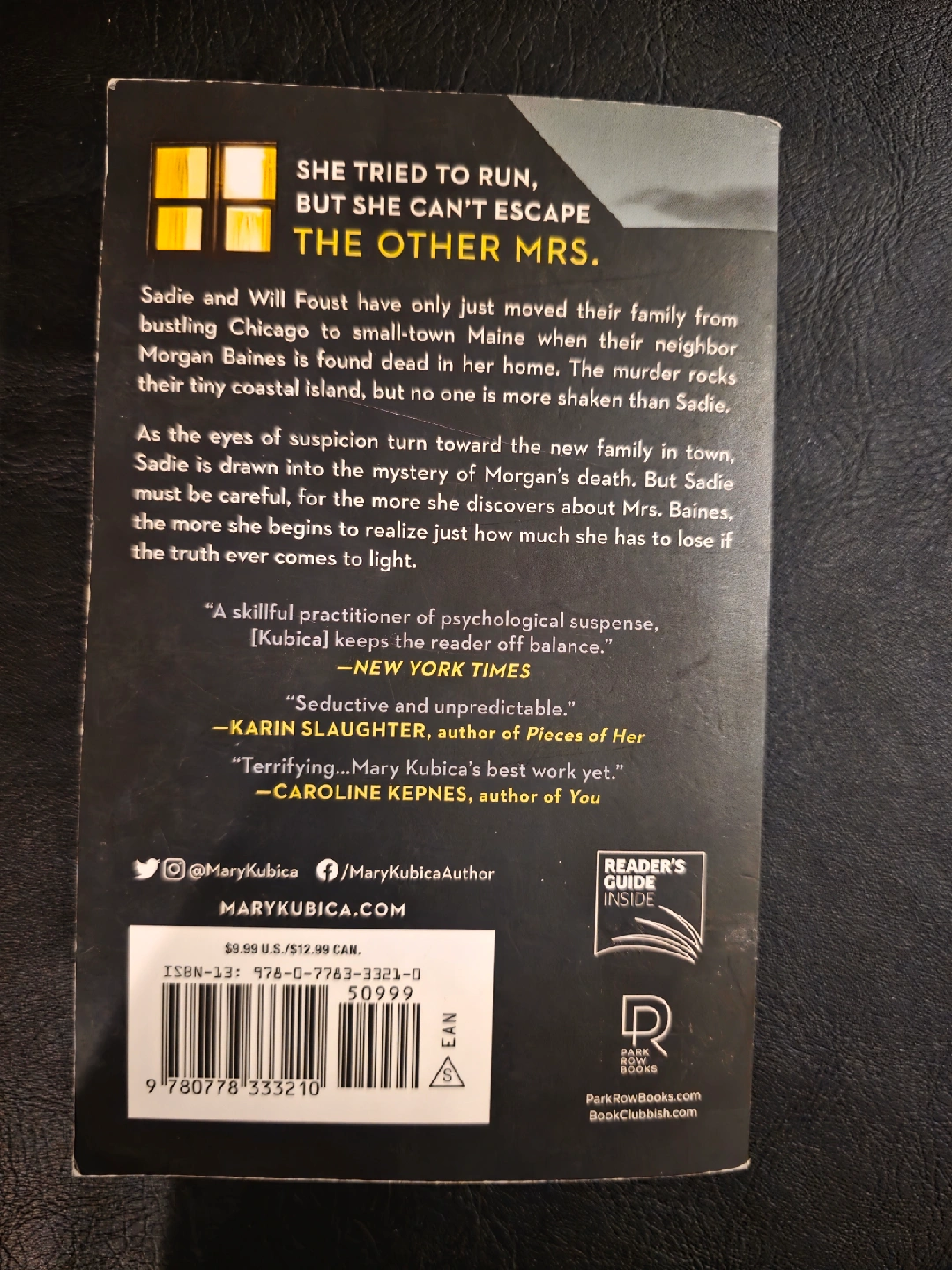 Selling a copy of 'The Other Mrs.' by Mary Kubica! It's a novel that's sure to keep you on the edge of your seat with its psychological suspense and jaw-dropping twists. Perfect for readers who enjoy a good thriller!