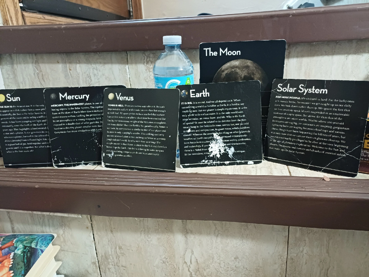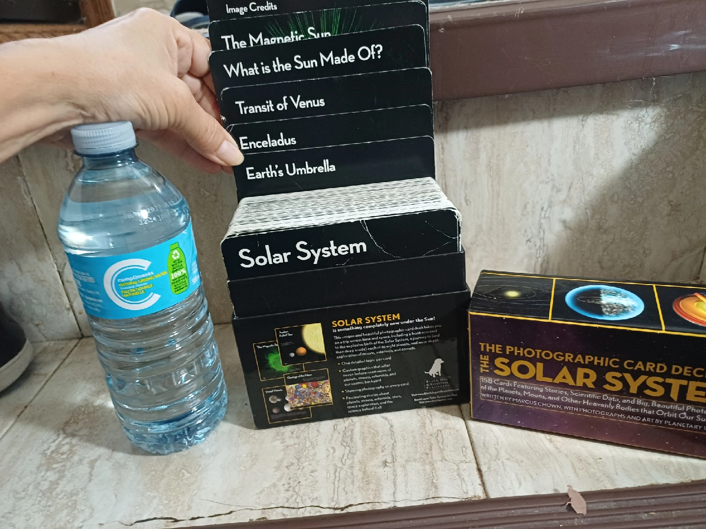 "The Photographic Card Deck of The Solar System" by Marcus Chown with photographs and art by Planetary Visions It features 158 cards with stories, scientific data, and big, beautiful photographs of the planets, moons, and other heavenly bodies that orbit our Sun It is a unique and beautiful photographic card deck that takes you on a trip across time and space. Photographs shows the EARTH card has slight damage that I will try to repair