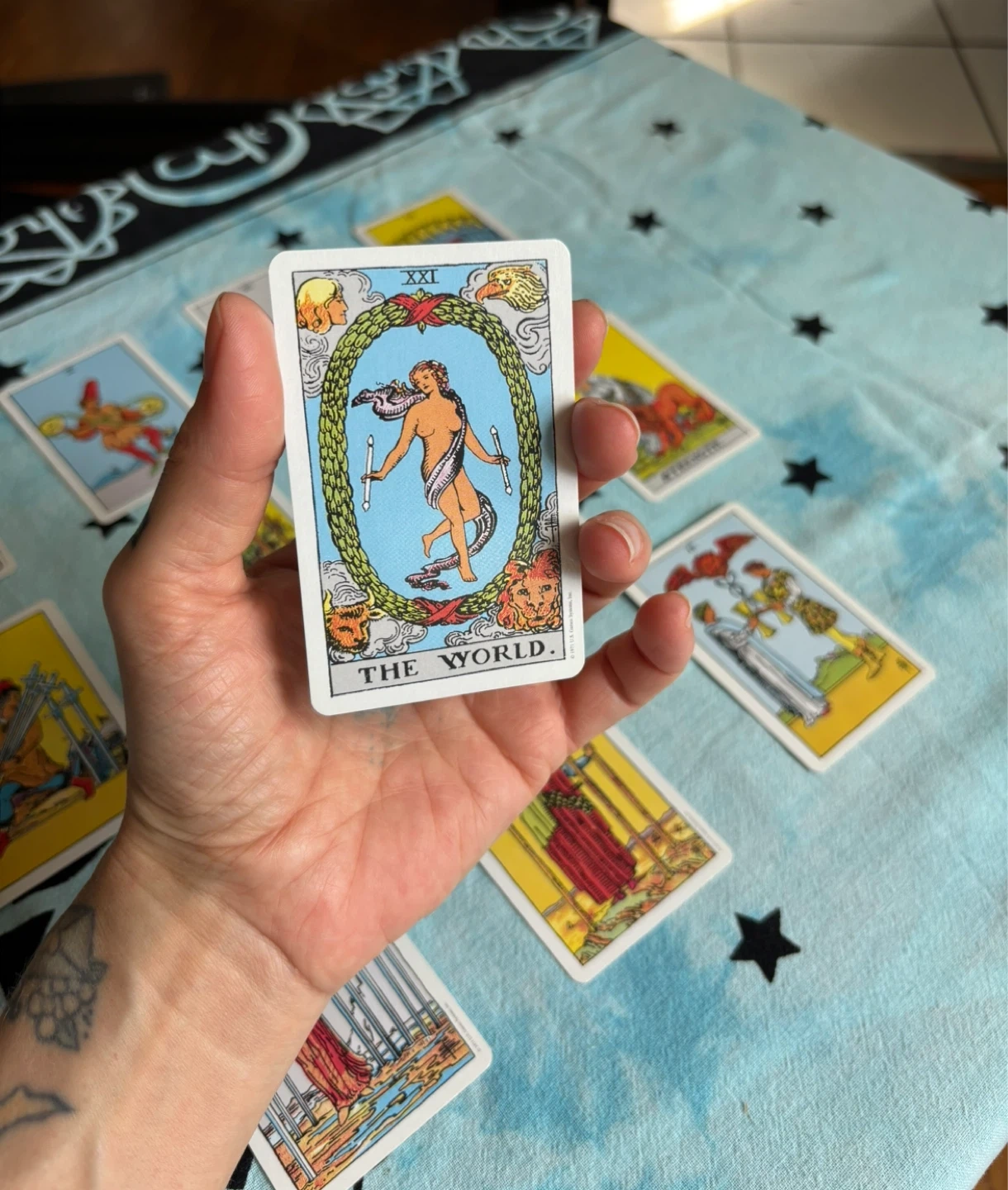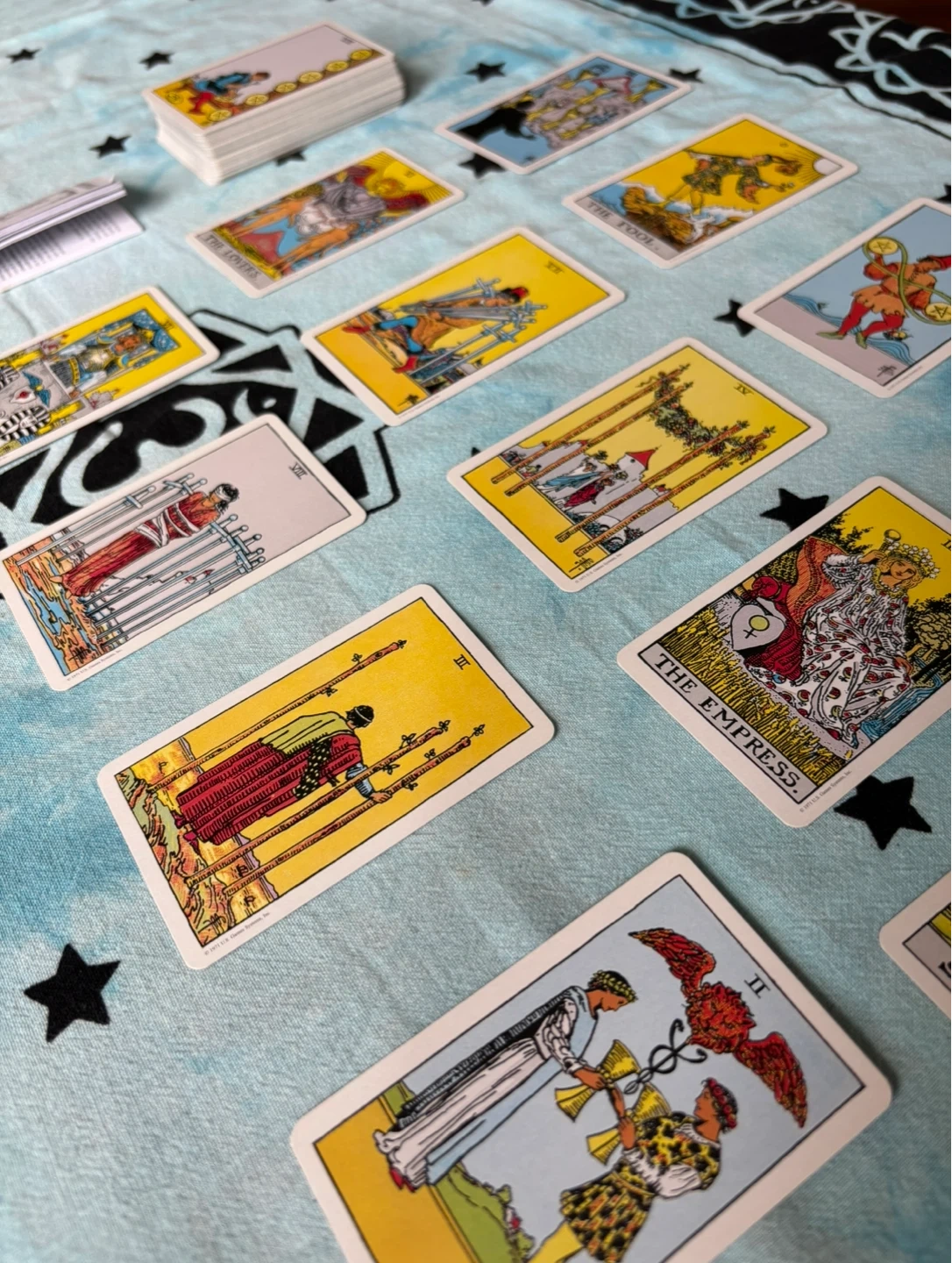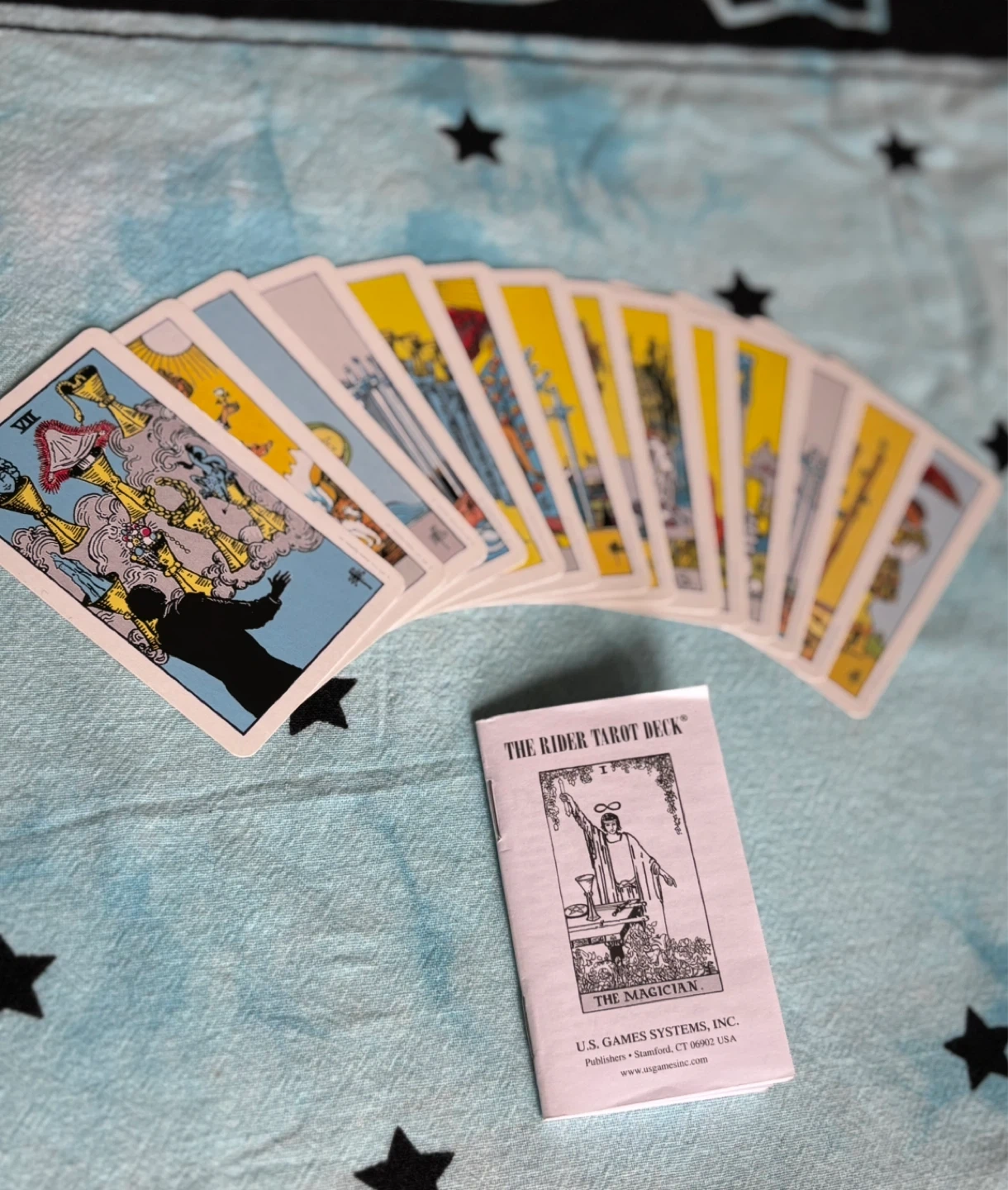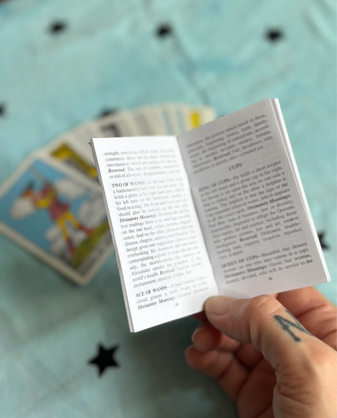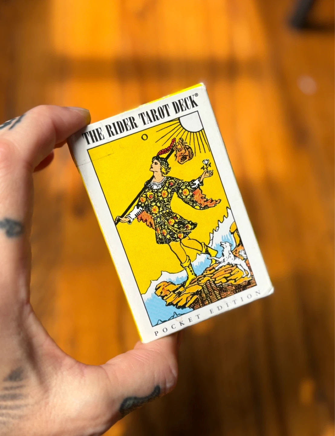 The Rider Tarot Deck, pocket edition! It comes with the deck of cards and the original instruction booklet. Super fun for traveling & entertaining friends From more I depth readings like the Celtic Cross.. to simple Past, Present, Future Readings 🤗🔮