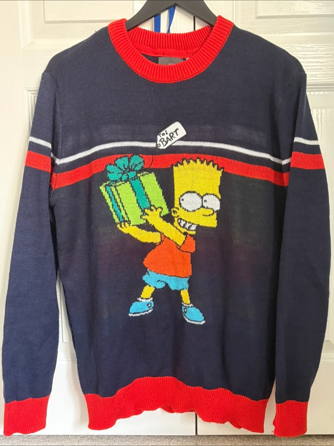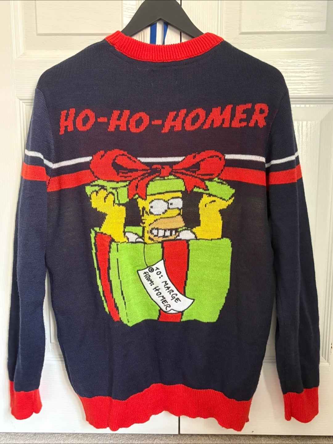 Get ready for the holidays with this fun Simpsons Christmas sweater! It features Homer and Bart with presents. Perfect for adding some festive cheer to your wardrobe
