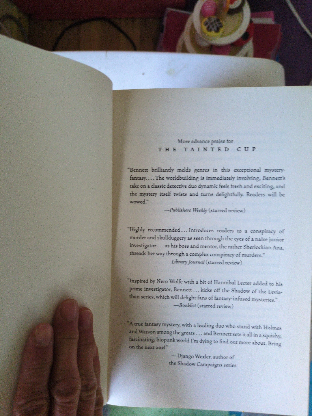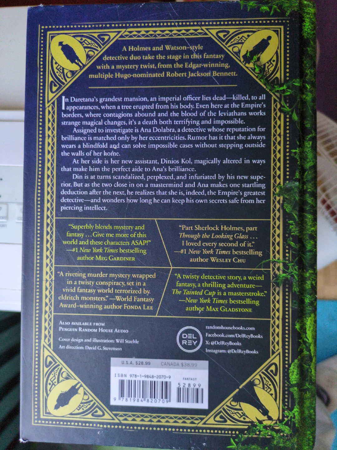 Like new. Selling a copy of "The Tainted Cup" by Robert Jackson Bennett! It's a mystery fantasy with a Holmes and Watson-style detective duo. The book has received praise from various journals and authors, as seen on the back cover. Perfect for anyone who enjoys a complex conspiracy of murders and well-developed worldbuilding! Originally priced at $28.99 USD.