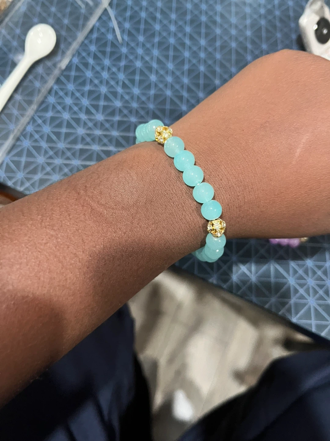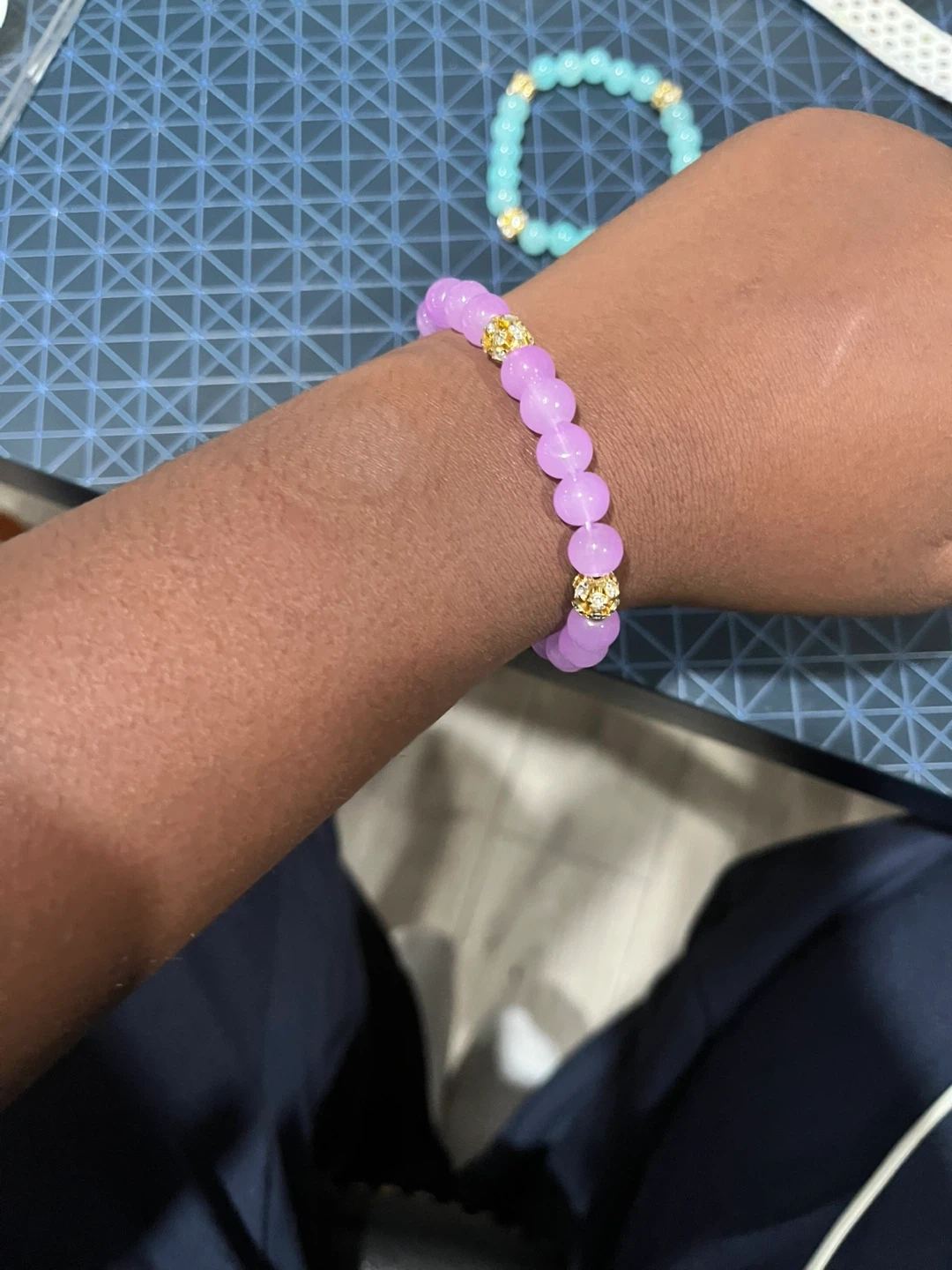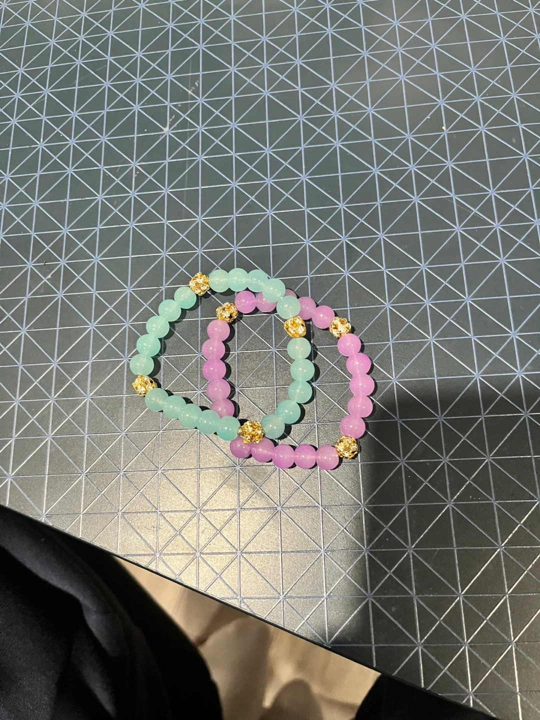 two very pretty matching bracelets the string is very stretchy. Just don’t stretch it too much or else it’ll get stretched out.