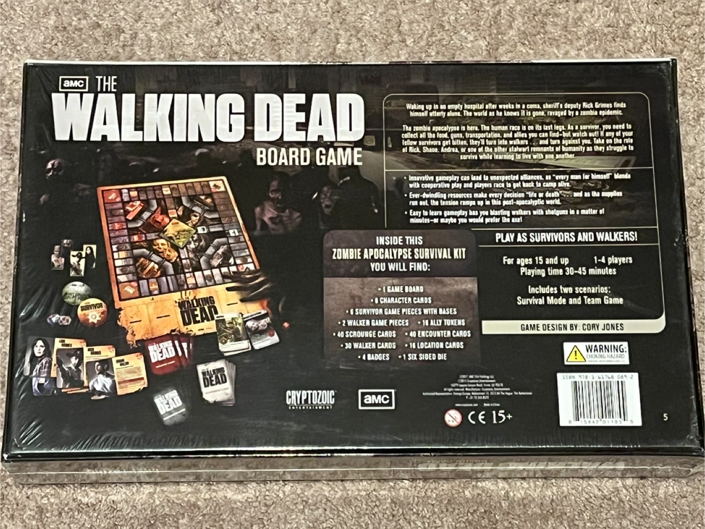 Selling a brand new, still-sealed copy of The Walking Dead board game! Play as survivors and walkers in this post-apocalyptic adventure. Inside the Zombie Apocalypse Survival Kit, you'll find: - 1 Game Board - 6 Character Cards - 6 Survivor Game Pieces with Bases - 2 Walker Game Pieces - 16 Ally Tokens - 46 Scrounge Cards - 40 Encounter Cards - 30 Walker Cards - 16 Location Cards - 4 Badges - 1 Six-Sided Die Perfect for 1-4 players, ages 15 and up! Includes two scenarios: Survival Mode and Team Game Pick up Rivergrove Area From a sf/bf/dog friendly home
