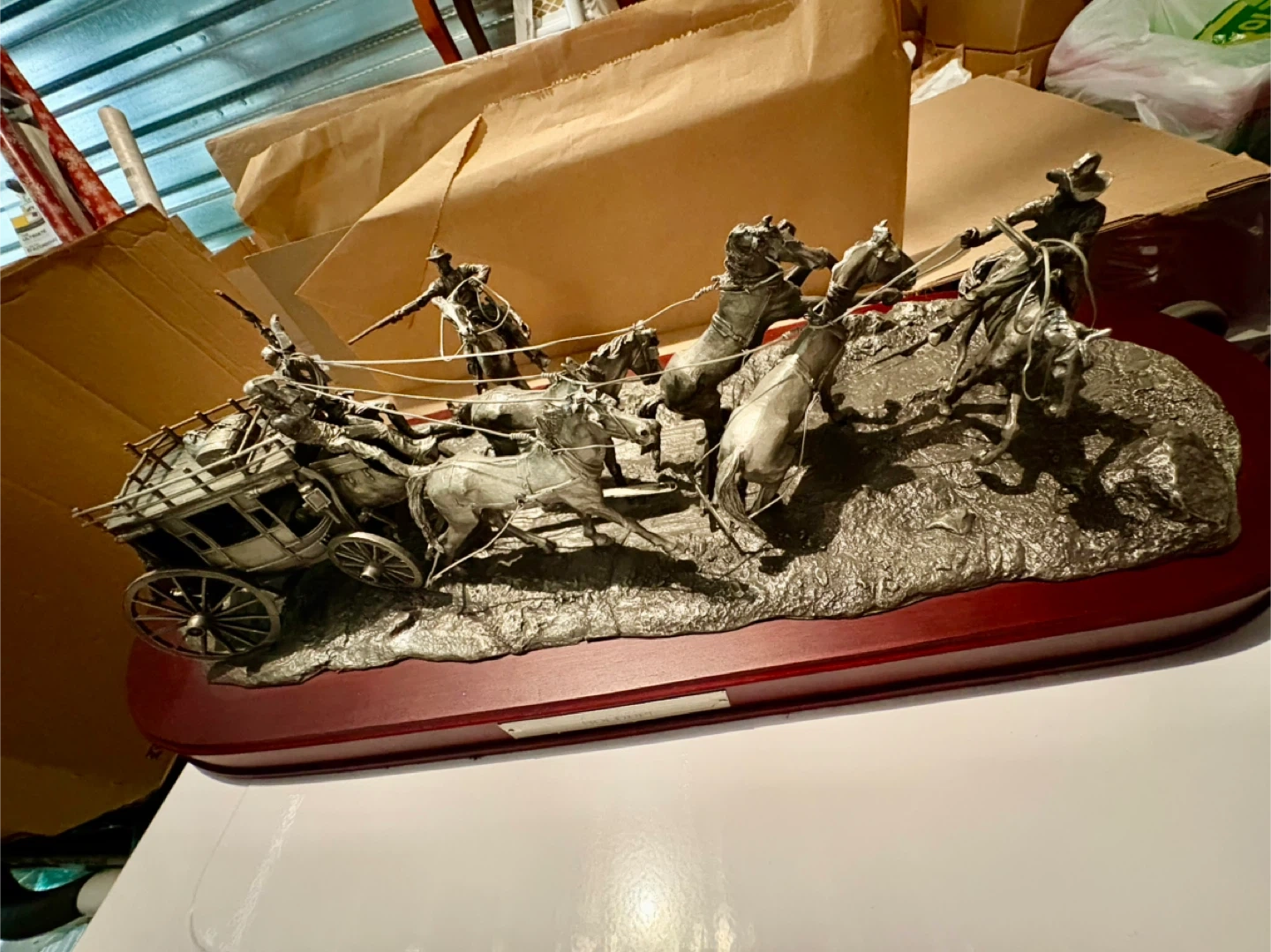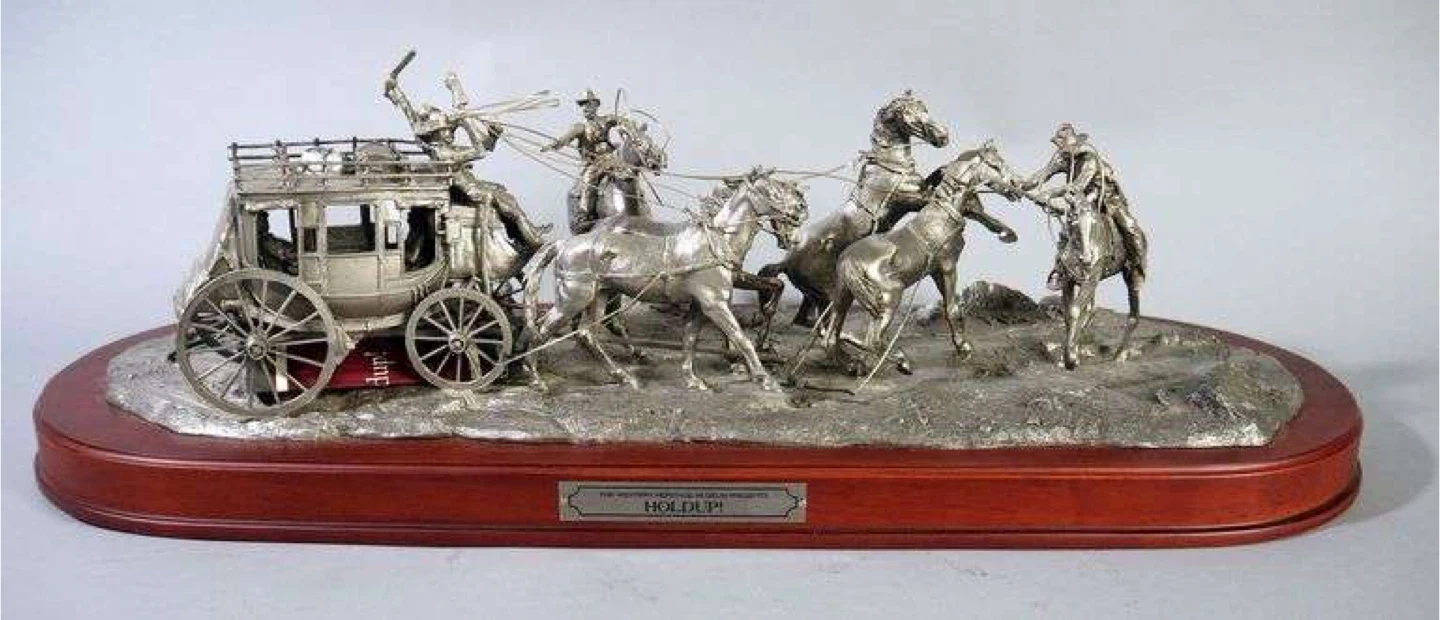 Selling a detailed sculpture titled "Holdup!" presented by The Western Heritage Museum. It features a stagecoach and horses in a dynamic scene. The sculpture is mounted on a wooden base.