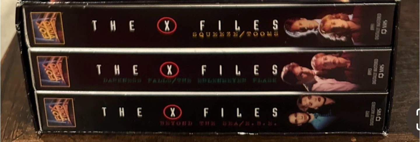 Selling a set of The X-Files VHS tapes from Fox Video. Includes episodes 'Squeeze/Tooms', 'Darkness Falls/The Erlenmeyer Flask', and 'Beyond the Sea/D.P.O.' Digitally mastered. Box slipcase included! All good condition