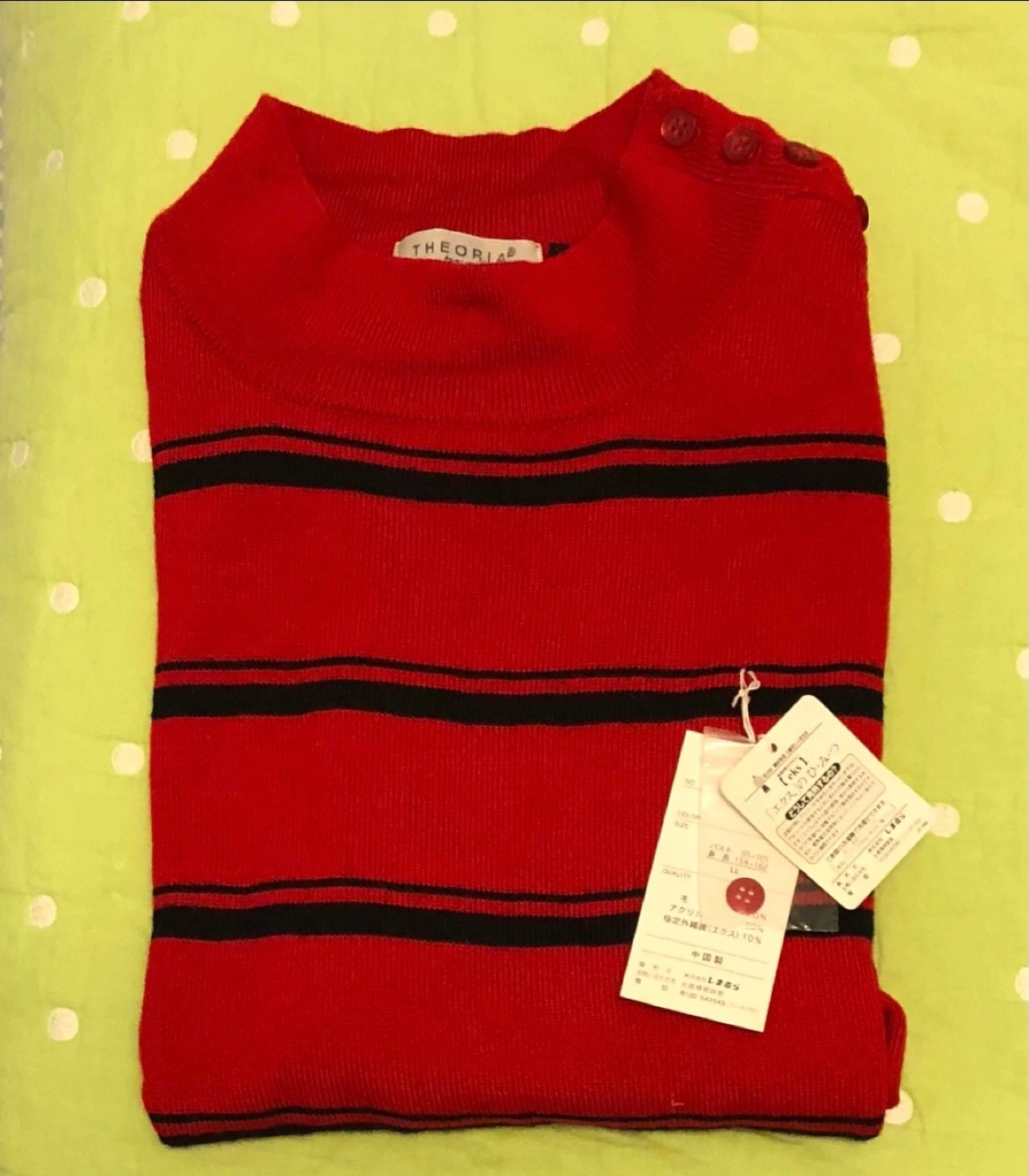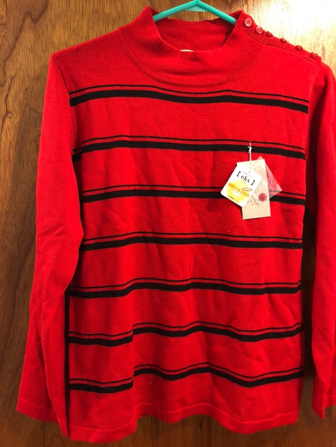 Red and black striped sweater with a mock neck and a button on the shoulder. Made in Italy. From pet/smoke free home Pickup from Christie station after 4:30pm during the week days