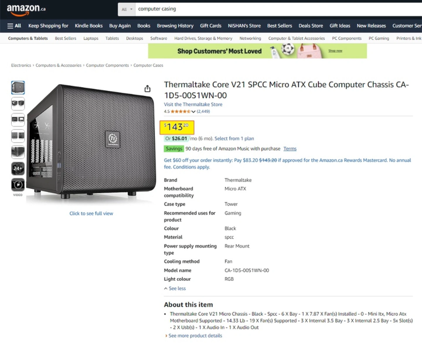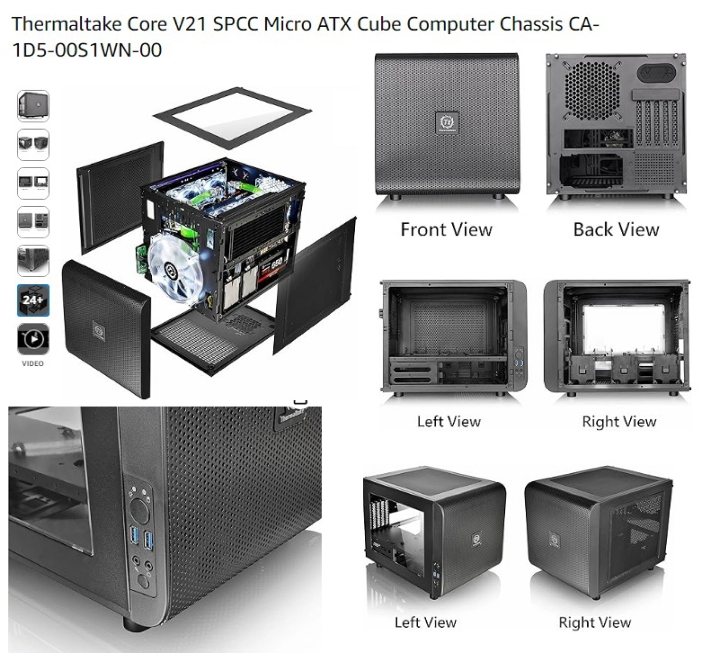 ThermalTake Core V21 SPCC Micro ATX Cube Computer Chassis CA-1D5-00S1WN-00 Black Body; 6 x Bay; 7.87 Fan (19x Fan Supported) Mini ITX, Micro ATX MotherBoard Supported; 3x Internal 2.5 Bay; 5x Slots; 2 USB; 1 Audio In; 1 Audio Out Asking Price $ 55- (Pickup from near Kingston Road & Markham Road…With Cash Only...I DON’T SHIP/Deliver) For Details Specification-https://a.co/d/g42iJRa