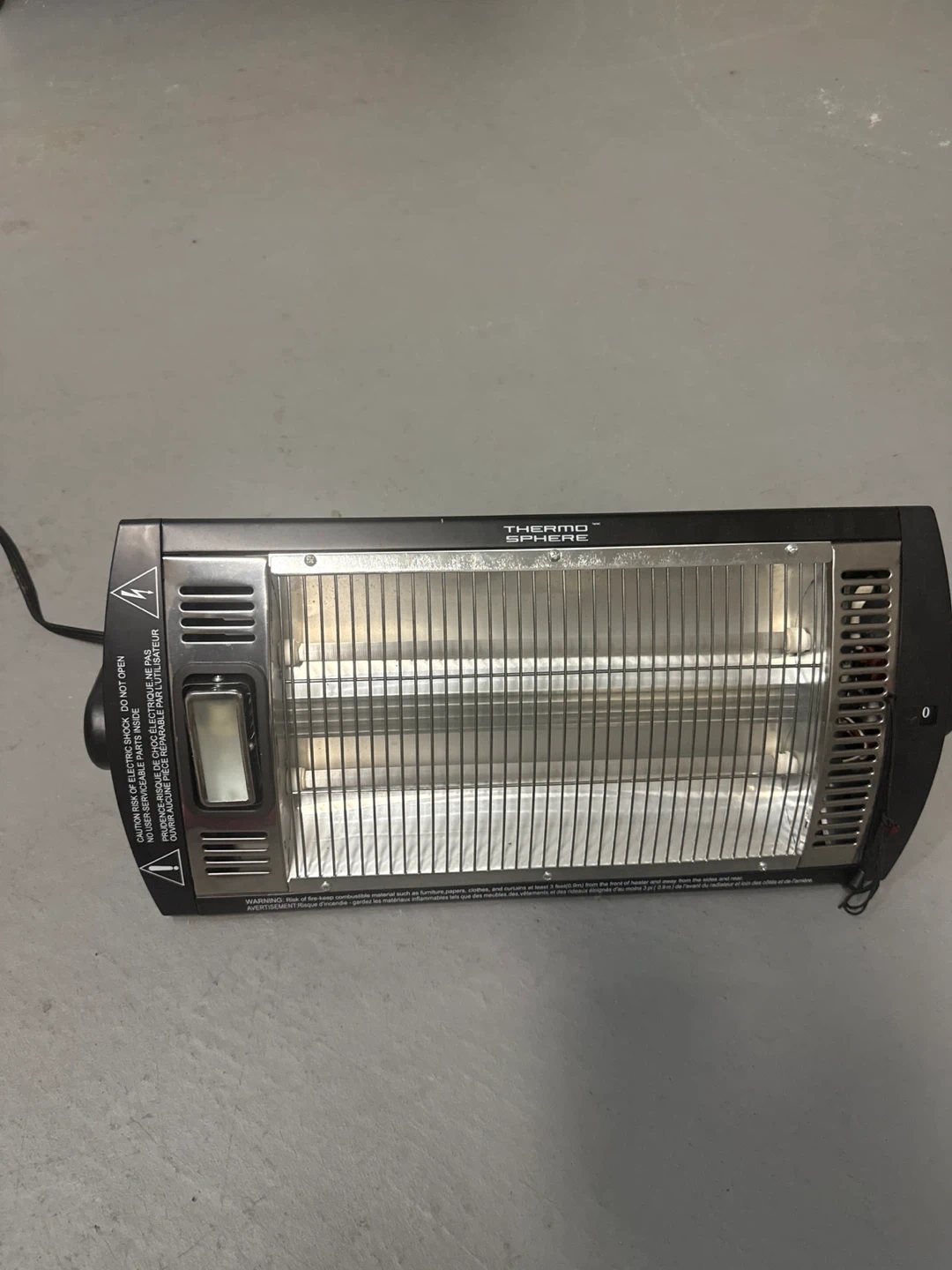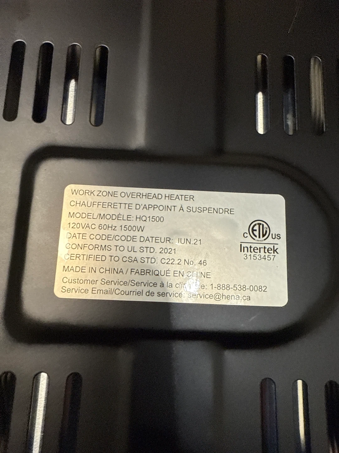 Selling a Thermo Sphere work zone overhead heater. The model number is HQ1500. It operates at 120VAC 60Hz and 1500W. It's in good working condition and ready to keep you warm!