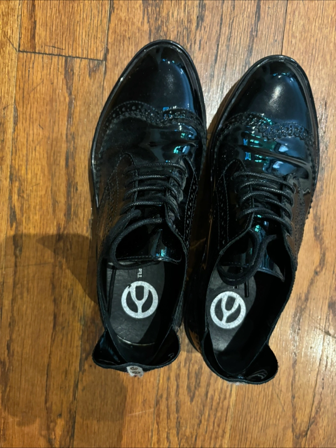 These are a pair of black patent leather Oxford shoes from Thesus!