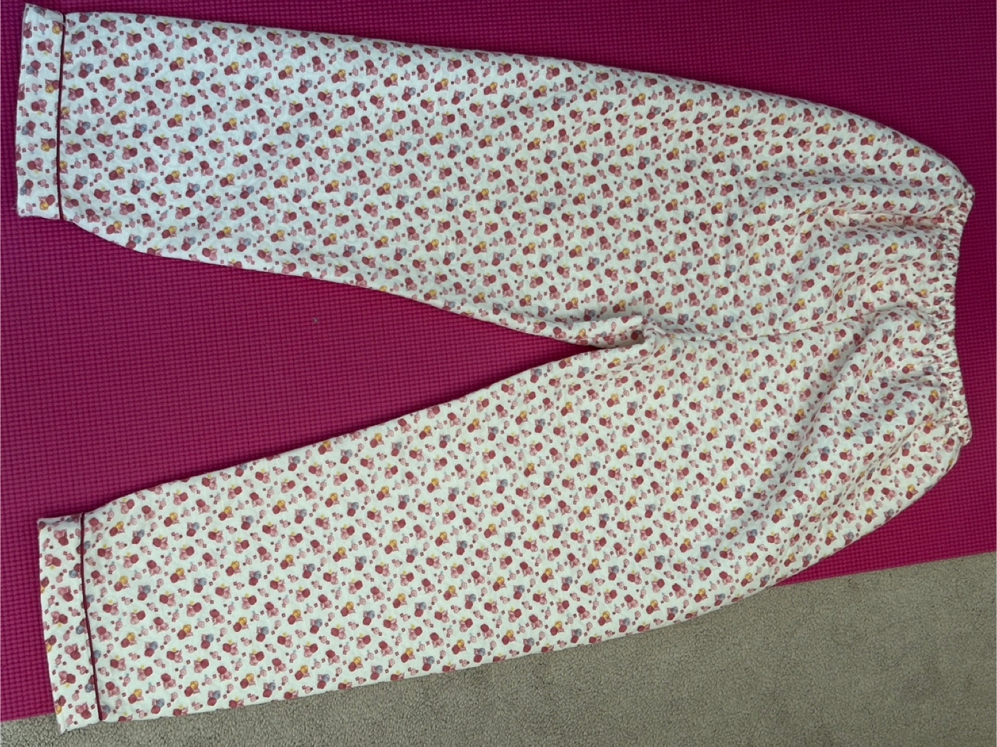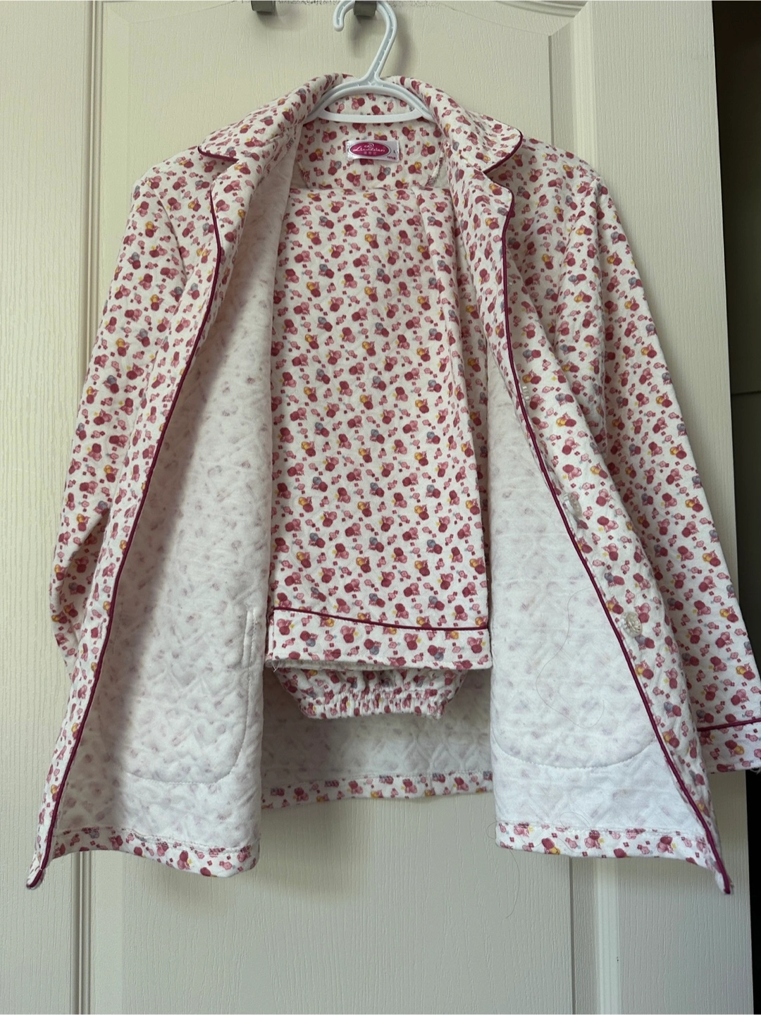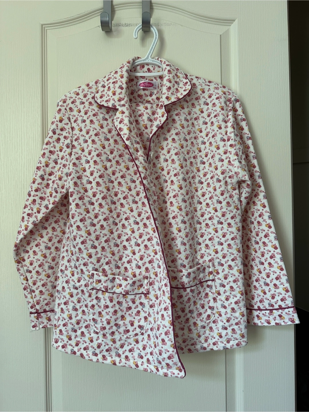 Cozy pink pajama set with a cute floral pattern. Perfect for lounging around the house. The set includes a button-down top and elastic waist pants. Super comfy! Brand new never worn. Got it gifted but not my style