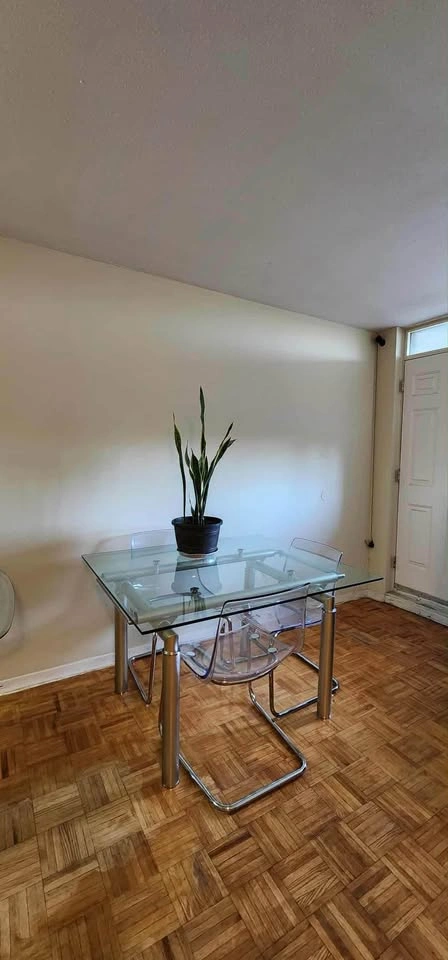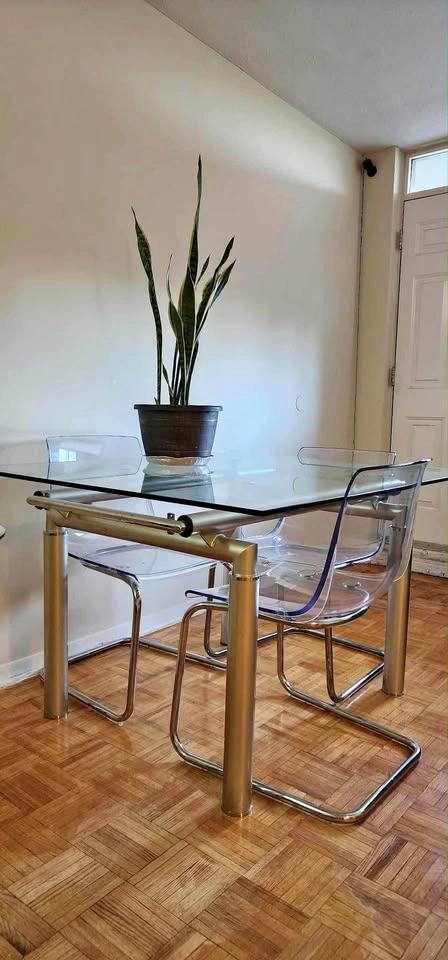 Glass dining table with thick glass and steel legs for sale. It seats 4 spaciously and is in good condition, with some normal scratches on the glass. The table used to be extendable, but is no longer due to broken glass during a move. CHAIRS NOT INCLUDED