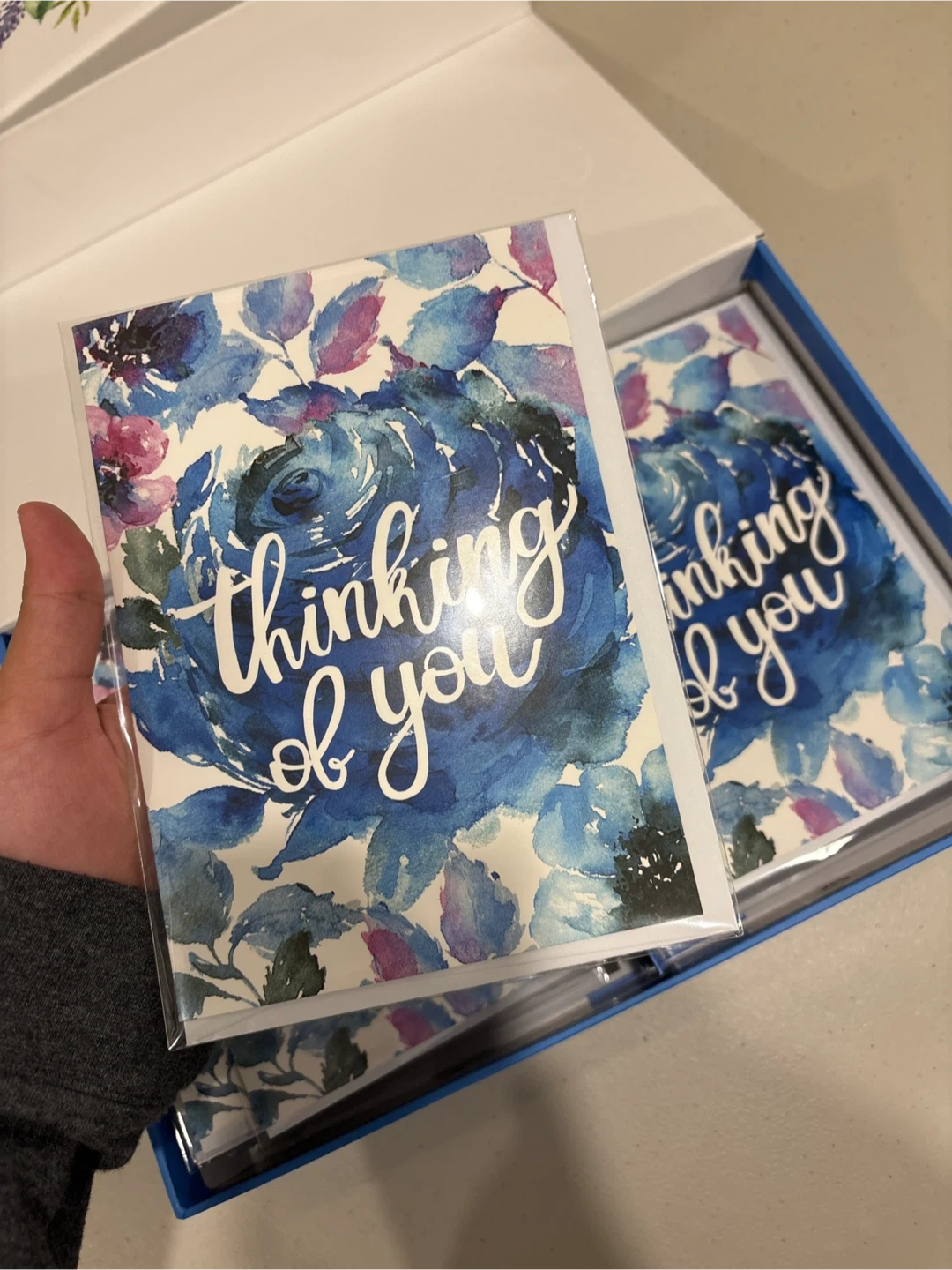 I have a new set of 'Thinking of You' greeting cards. They come in a box, with a envelope.Perfect for sending thoughtful messages to friends and family. The cards feature a beautiful floral design with a blue rose and the words 'thinking of you' written in elegant script 3 boxes available each box price is listed above
