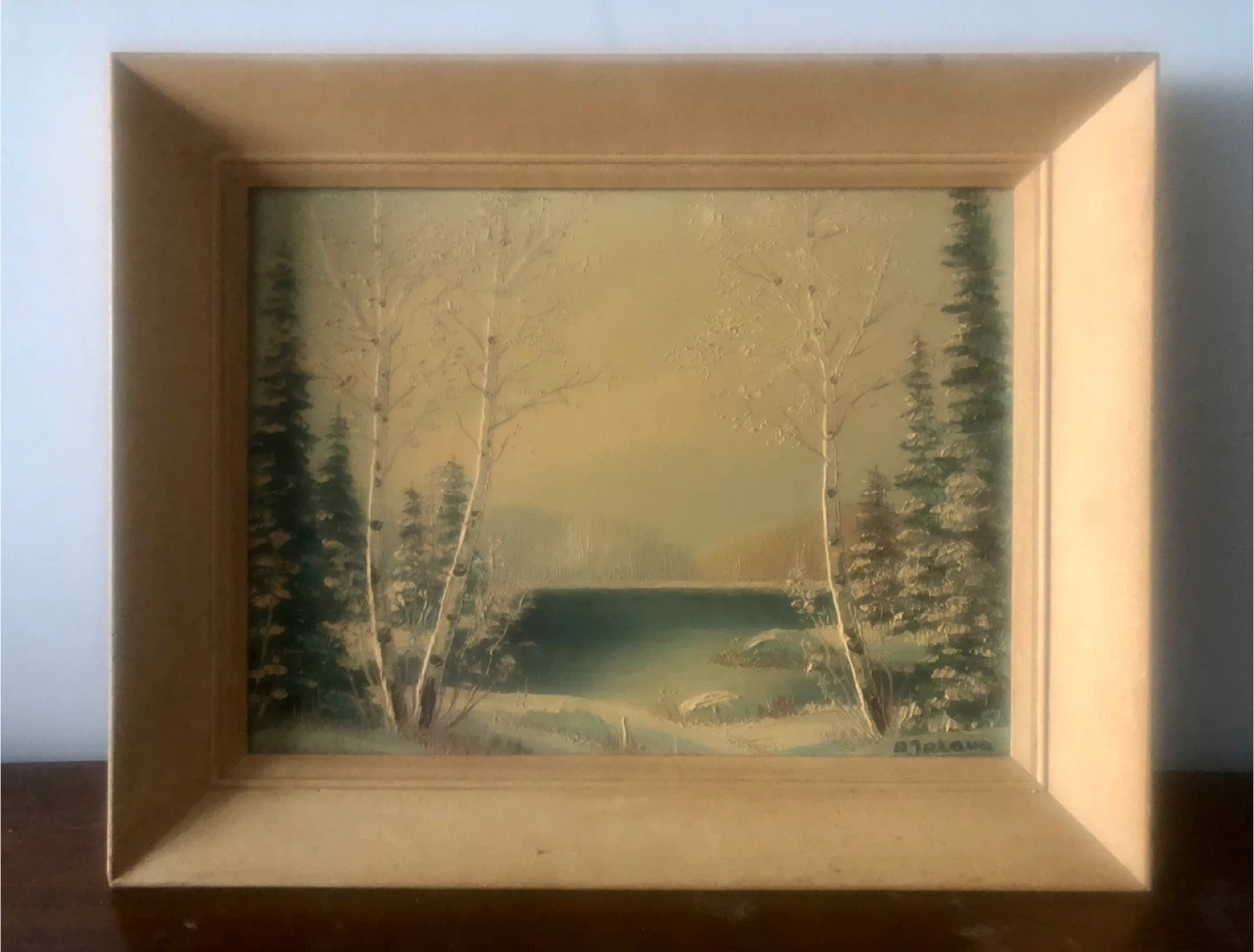 This is a vintage Canadian landscape painting by an artist with the last name "Jalava." The Jalava family was known for their Canadian landscape paintings in the 1950s and 60s. Their paintings were often similar in style and sold in gilt wood and gesso frames. The painting depicts a winter landscape with snow-covered trees and a body of water.