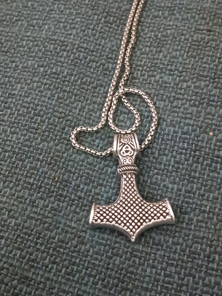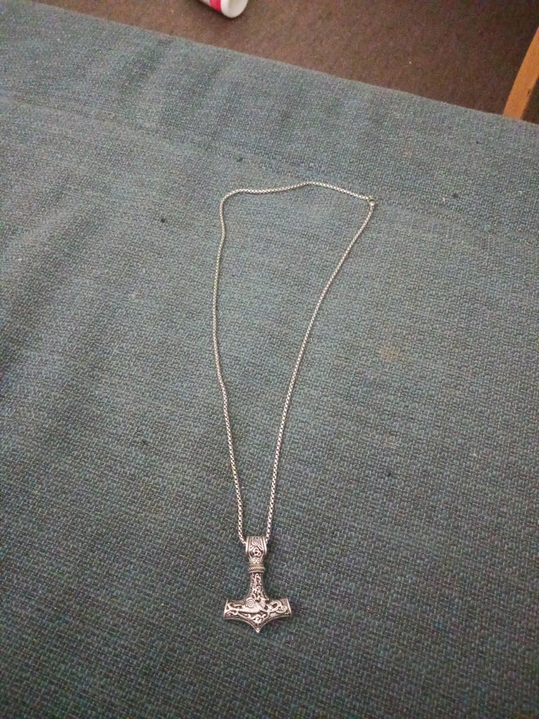 Selling a Thor's Hammer pendant necklace. It's a silver-coloured metal pendant on a chain. The pendant has detailed Norse-inspired designs on both sides. It's in great condition and ready for a new home!