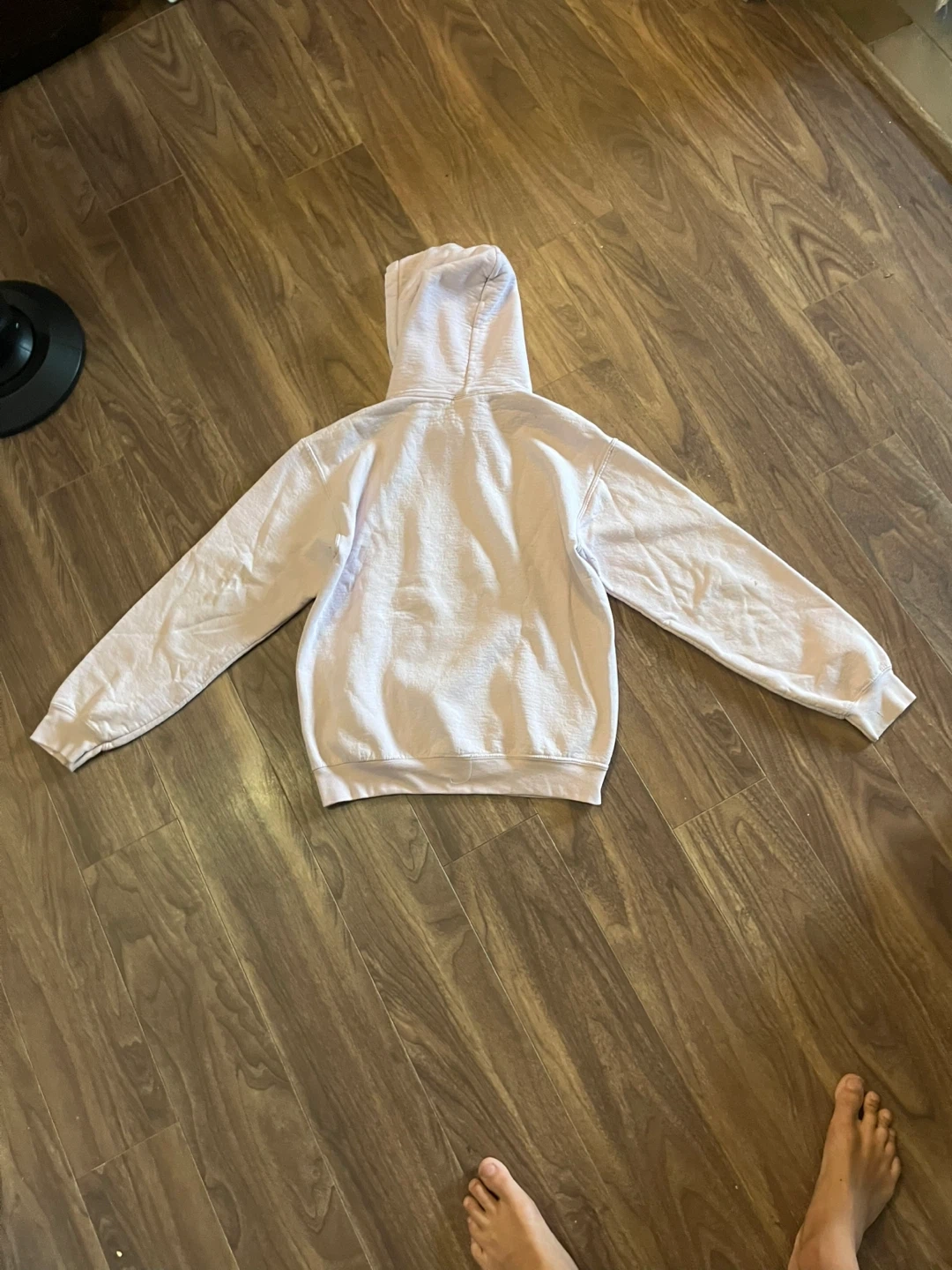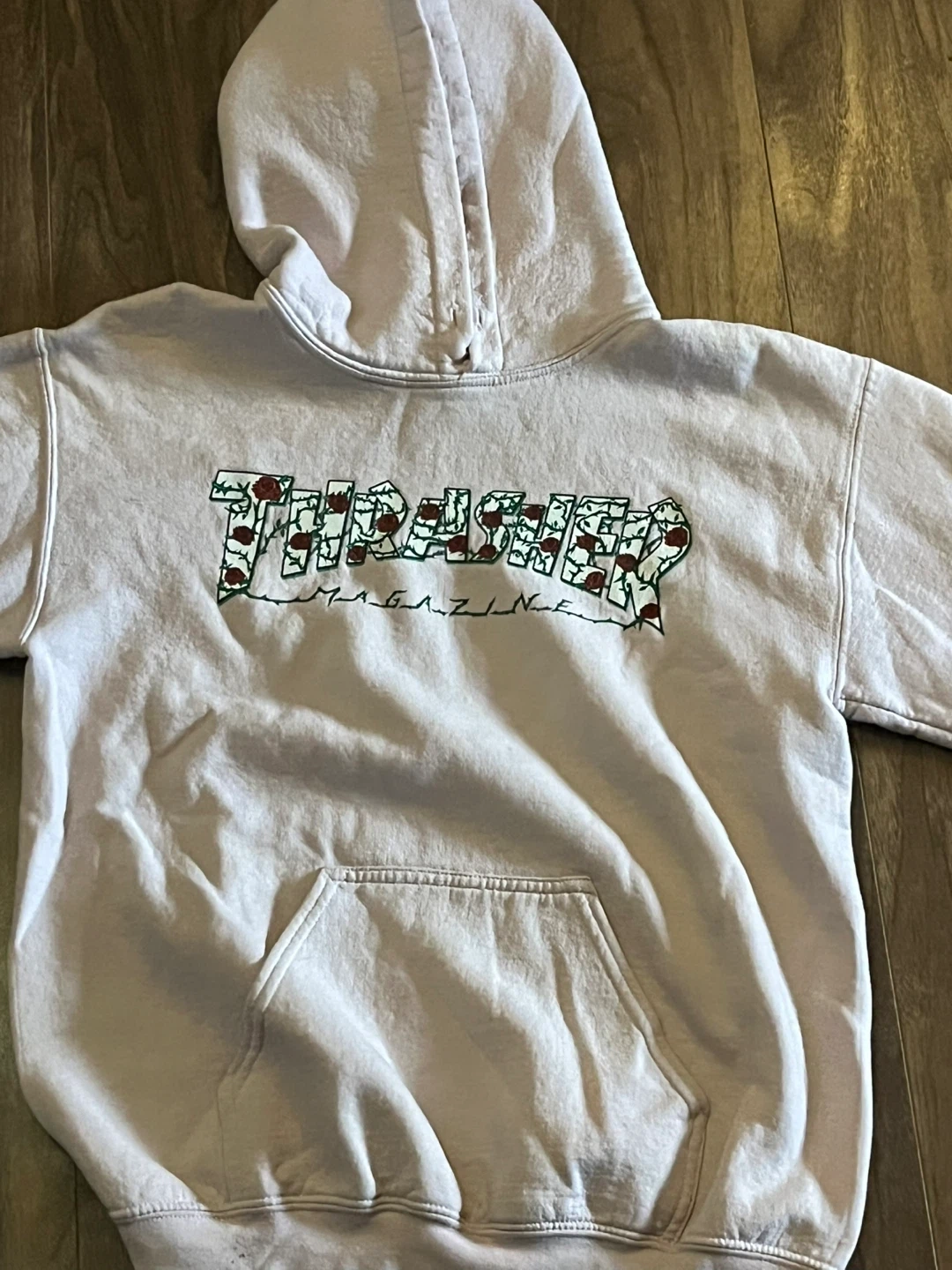 Selling a Thrasher Magazine hoodie in a lady small it's a light pink colour. It's in great condition and has a cool floral design on the logo. Perfect for staying cozy!