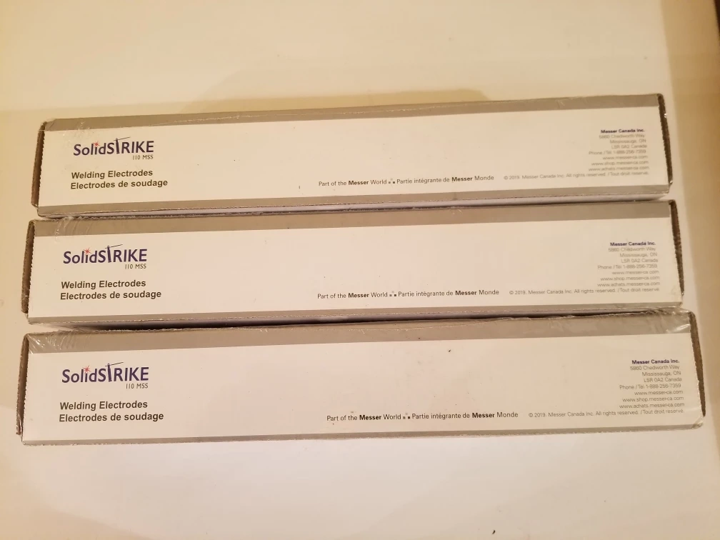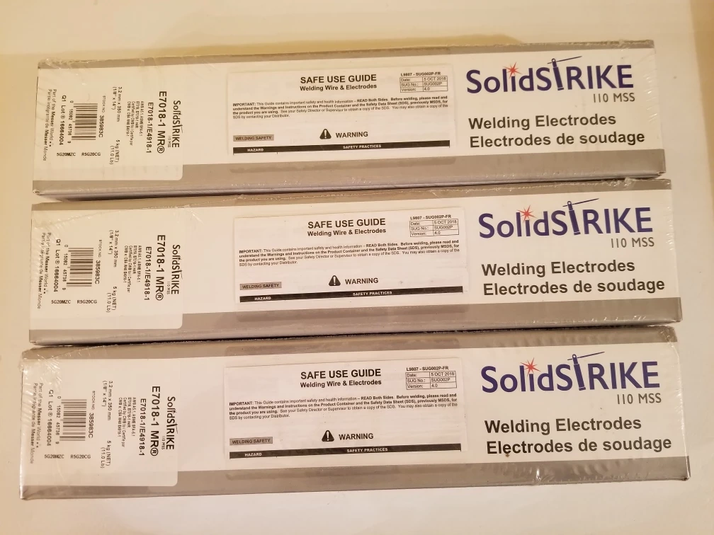 Three unopened boxes of SolidStrike 110 MSS MR welding electrodes. E7018-1/E4918-1 Weight: 5kg (11.0Lb) Each Size: 3.2mm × 350mm $195 OR MAKE ME A BETTER OR REASONABLE OFFER