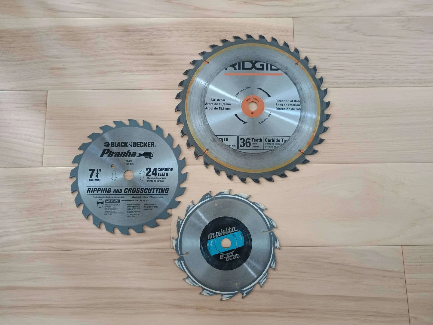 Bundle of 3 saw blades: 10 in Ridgid 36 teeth 7 1/4in Black&Decker 24 teeth 6 1/2 Makita 16 teeth All in great condition. Selling as a bundle. Pickup in Ajax.