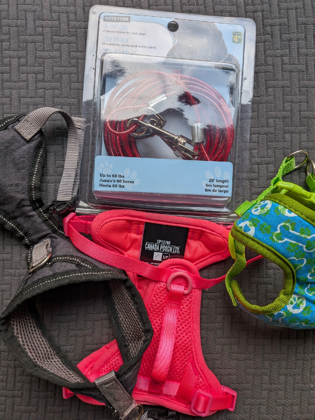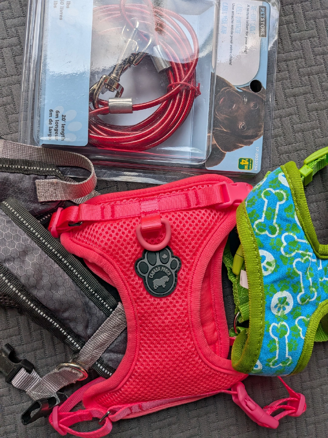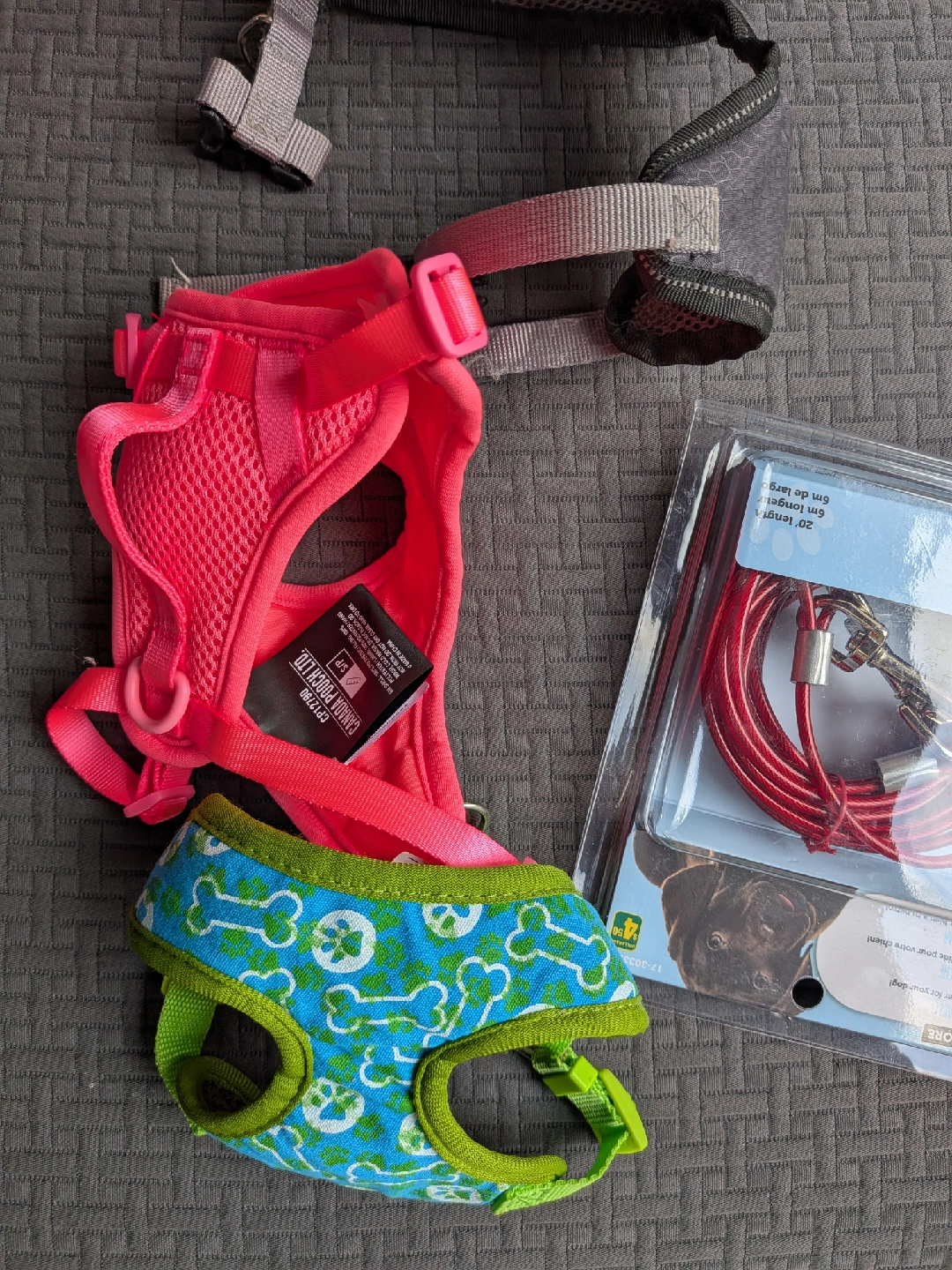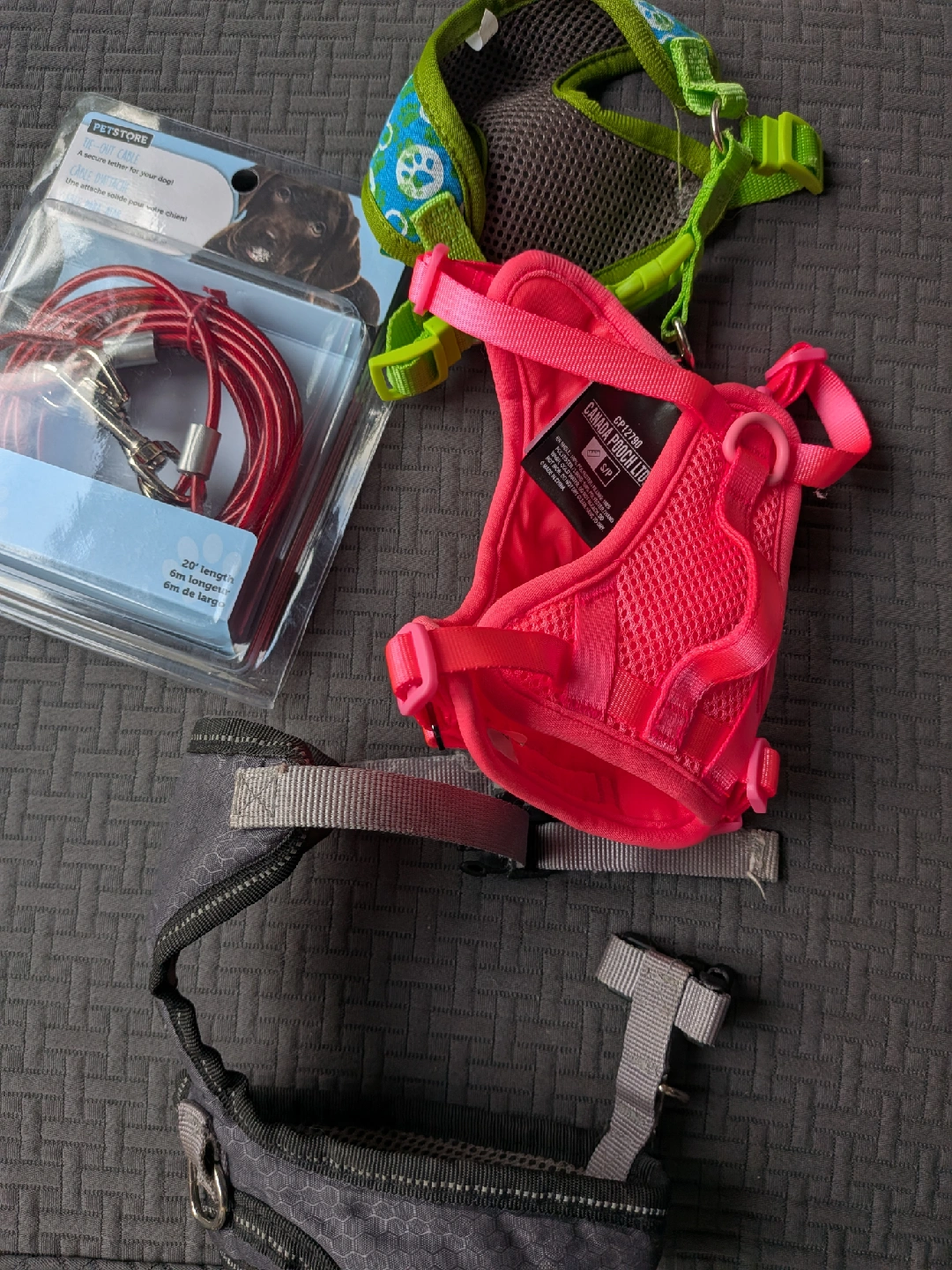 SMALL DOG bundle of dog harnesses and a tie-out cable! Includes: - Canada Pooch Pink Harness (S/P) New, no tag - Green & Blue Bone Pattern Harness - Gray Harness - Petstore Tie-Out Cable (20' length, up to 60 lbs) Cash only, no etransfers No holds, first come, first serve Location: Etobicoke. Rathburn Rd and Renforth dr. Etobicoke Olympium nearby