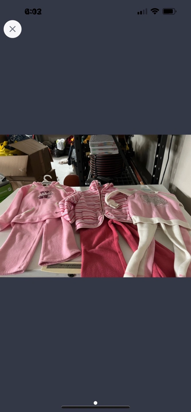 33Three adorable girls' outfits. Two sets include a zip-up jacket and pants. One set features a hoodie and pants. Each outfit - $5 each or all three for $10