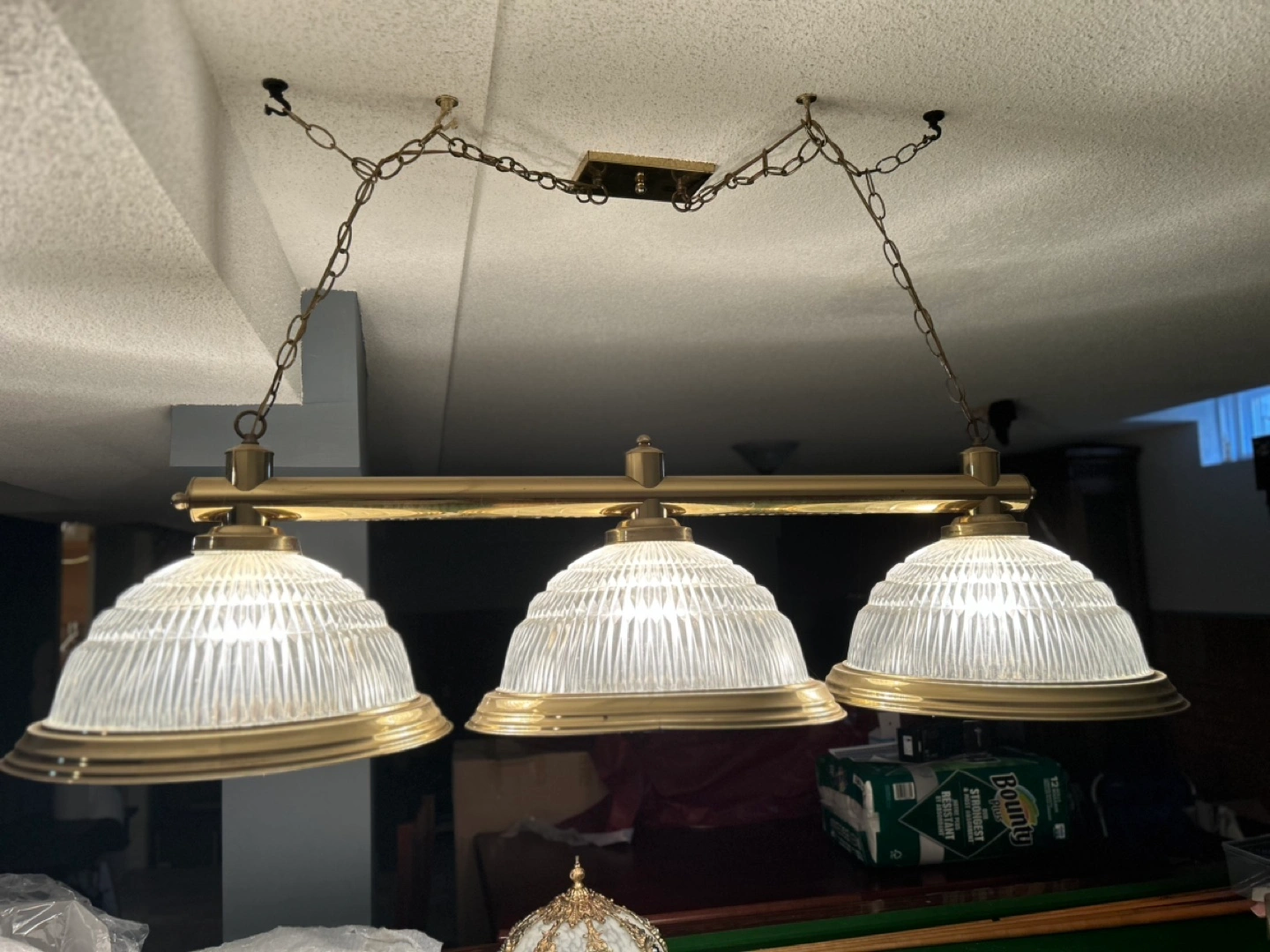 Three-light fixture, brass finish, clear glass shades. Hanging light ideal for pool tables. Good condition.