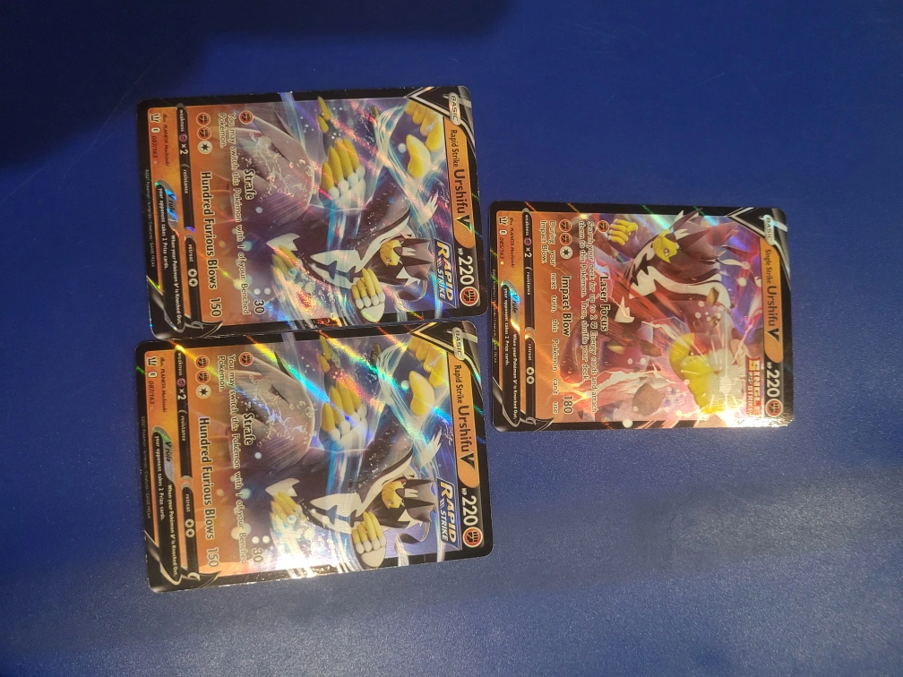 Three Pokemon trading cards. All are Urshifu V. Two are from the Vivid Voltage expansion and one from the Rebel Clash expansion. Good condition. cash only