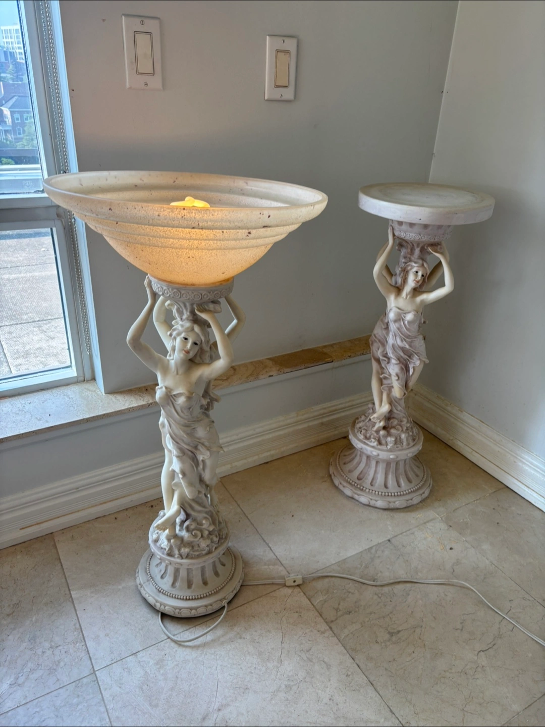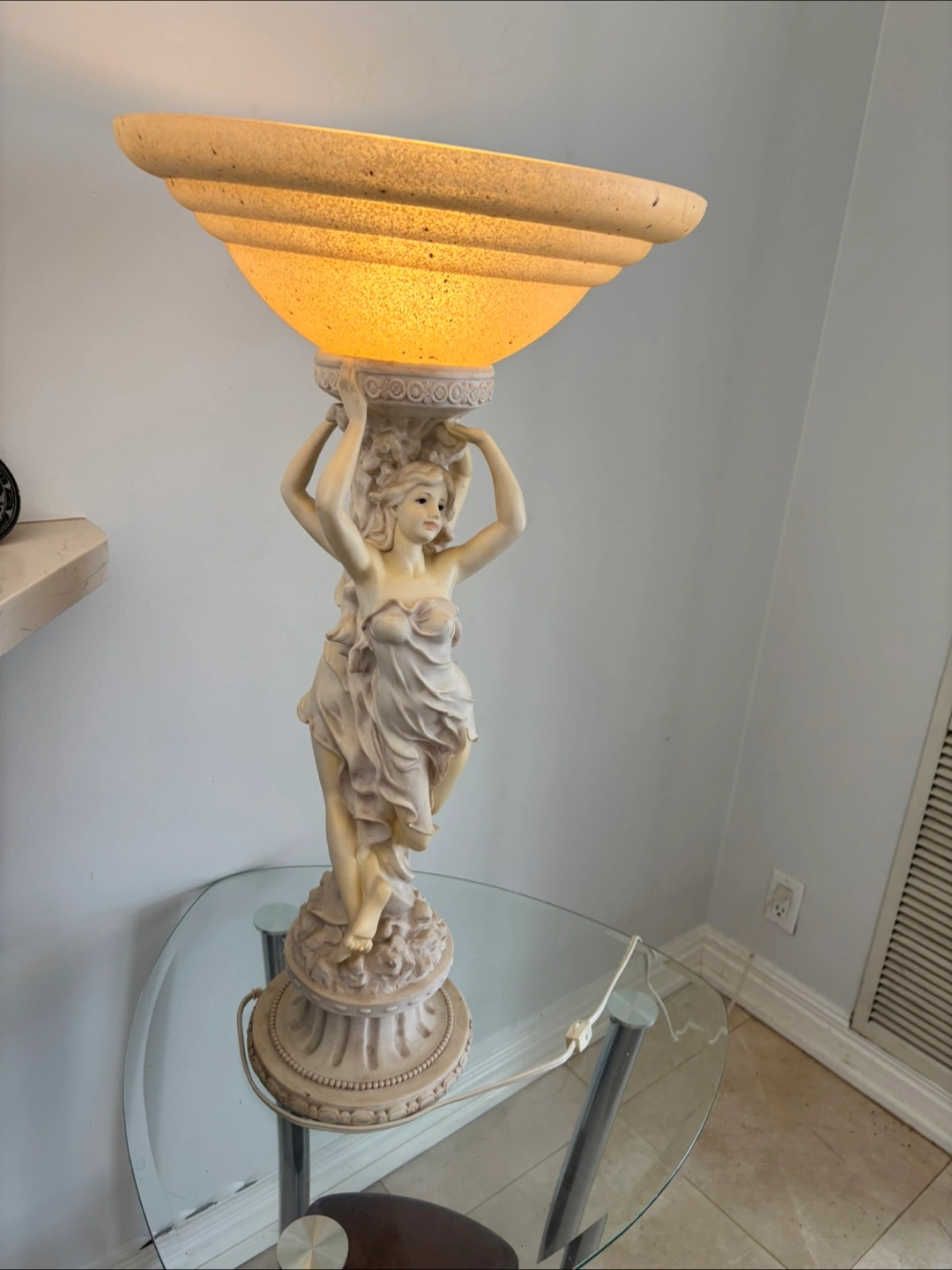Selling 2 vintage floor lamps and one stand featuring a lady figure holding a light. This unique piece adds a touch of classical elegance to any room. It's in good condition and ready to brighten up your space!