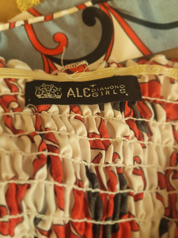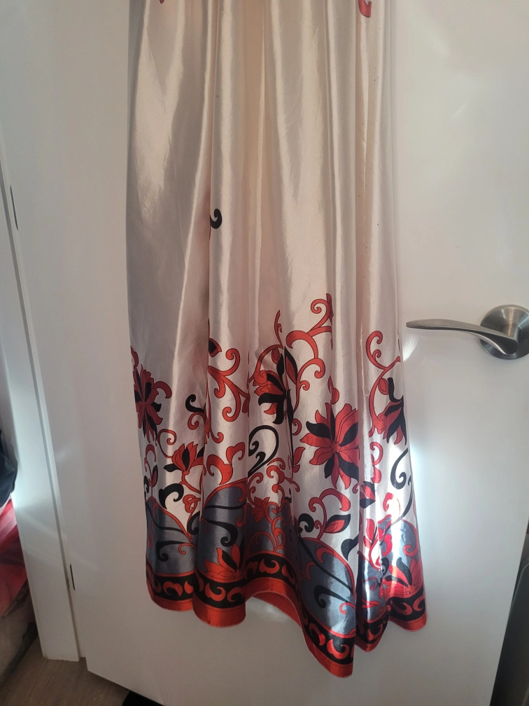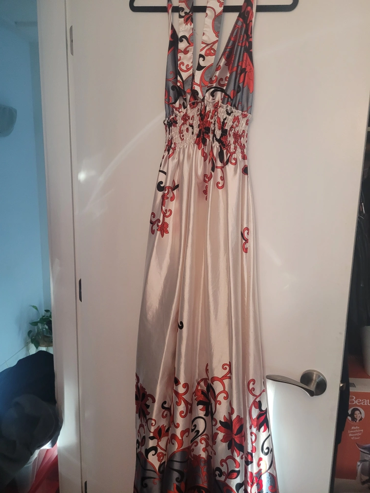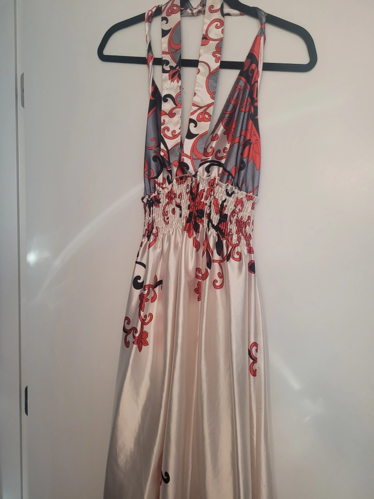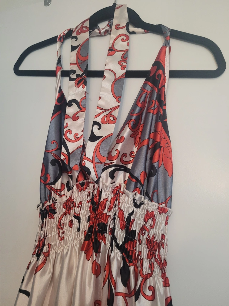 Floral maxi dress, halter top, elastic waistband, white, grey, and red. very gently used