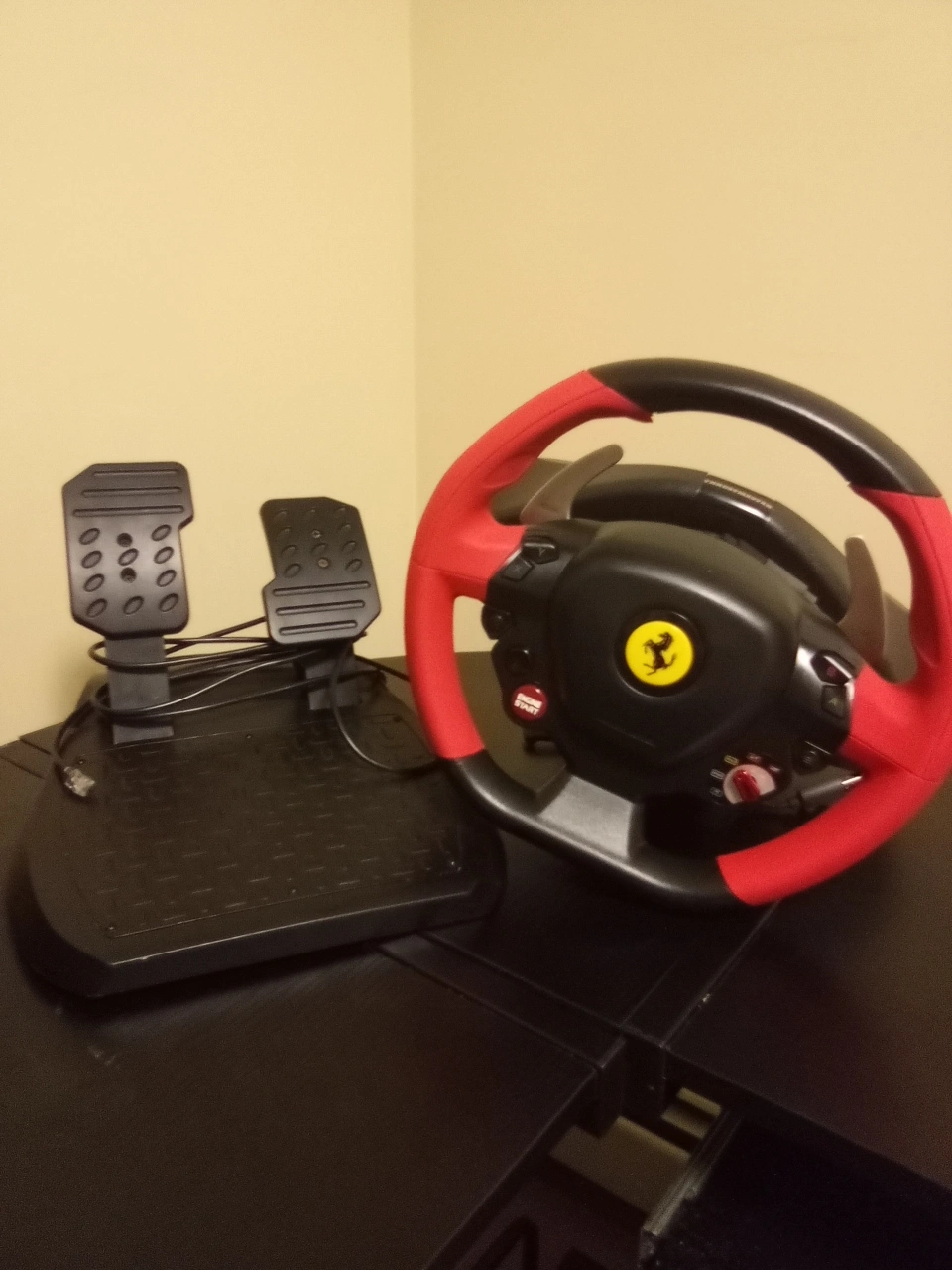 Get ready to race with this Thrustmaster Ferrari racing wheel and pedal set! Perfect for anyone who loves racing games and wants a more immersive experience. The set is in great condition and ready for a new home!