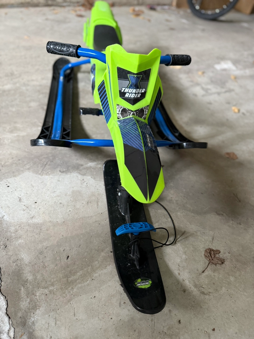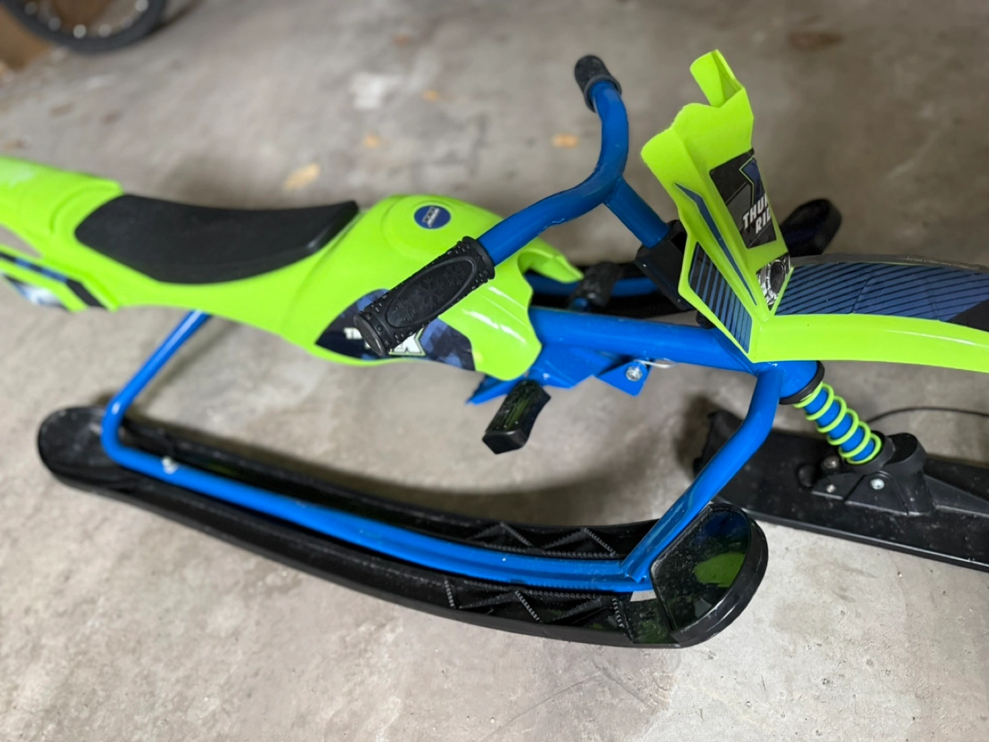 Fun snow sled for kids. Steering handlebars and comfortable seat. Durable plastic construction. Two skis for stability. Great for winter fun!