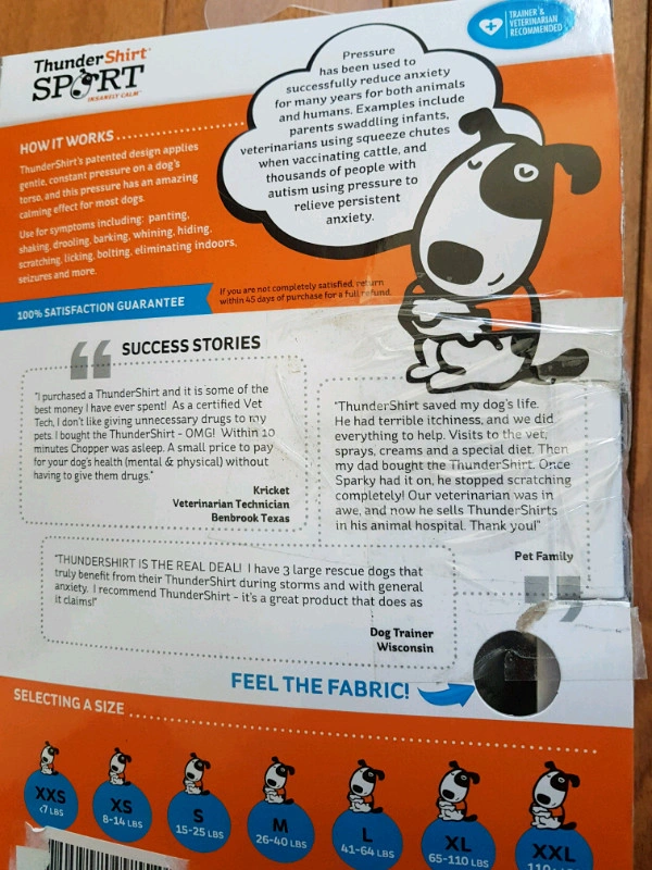 New in box. Applies soft, gentle pressure to relieve anxiety. Has a remarkable calming effect on most dogs. 100% Polyester - soft, breathable, washable fabric. Safe, effective, and drug-free. Easy to use. Reflective logo.