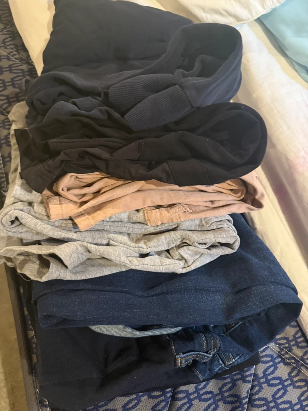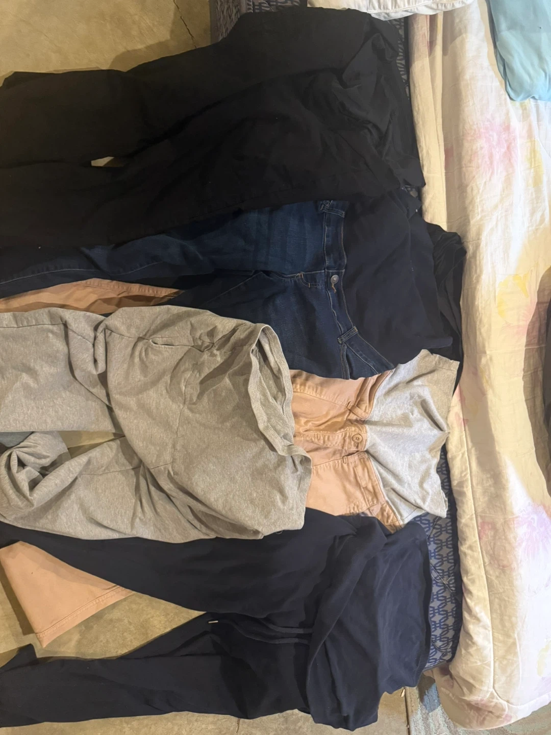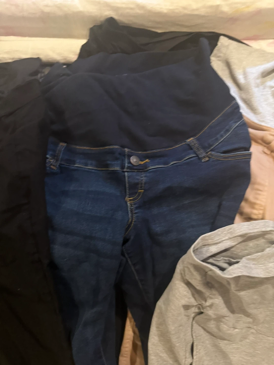 Selling a bundle of maternity clothes! Includes a pair of Thyme maternity jeans in size large, and a grey H&M top in size XL. Both items are in good condition and ready for a new home I have 6 pants want to sell for 10 dollar each.