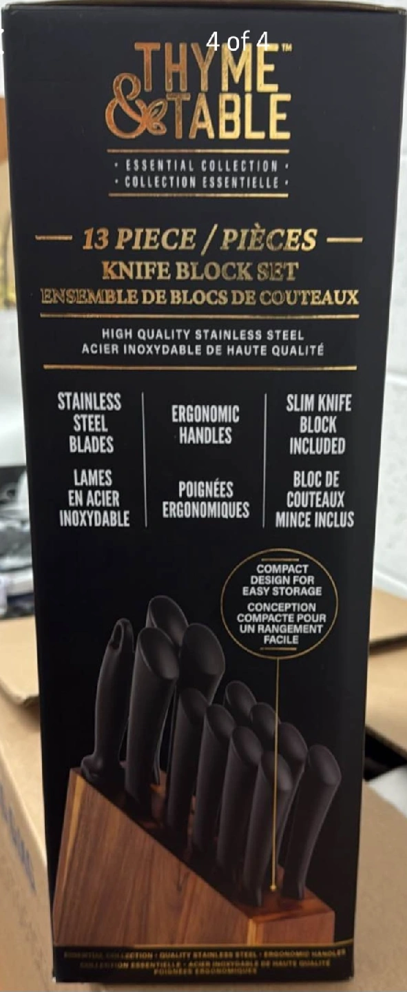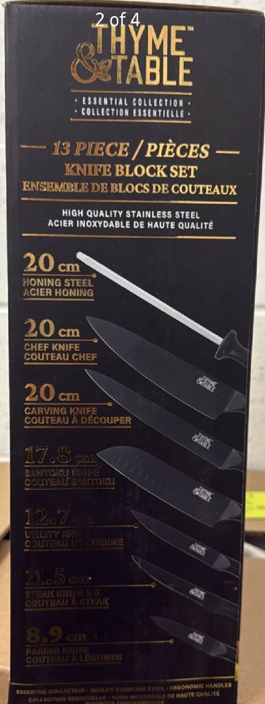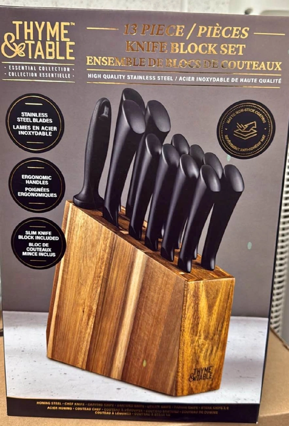 Selling a brand new Thyme & Table 13-piece knife block set! This essential collection features high-quality stainless steel blades and ergonomic handles. The set includes a slim knife block for compact and easy storage. The knives included are: - Honing steel (20 cm) - Chef knife (20 cm) - Carving knife (20 cm) - Santoku knife (17.8 cm) - Utility knife (12.7 cm) - Steak knife (11.5 cm) - Paring knife (8.9 cm) All pieces are new in box!