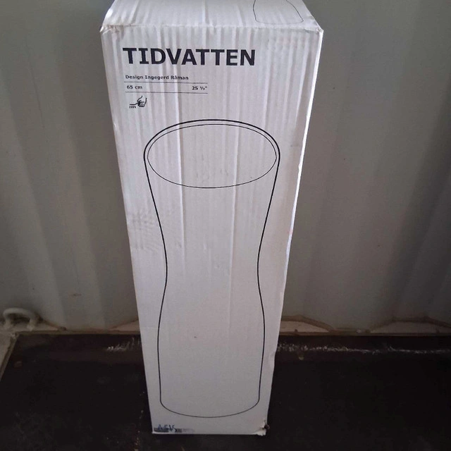 Enhance your home decor with this brand new Tidvattan clear glass vase, standing at 25 1/2 inches tall, perfect for displaying your favourite floral arrangements or as a standalone statement piece. This vase is new in its original packaging. Specifications: * Brand: IKEA * Model: Tidvattan * Height: 25 1/2 inches * Material: Glass * Colour: Clear Looking for a touch of elegance? This vase is just the ticket! It's so new, it practically sparkles with potential. Remember, if the ad's up, it's still available!