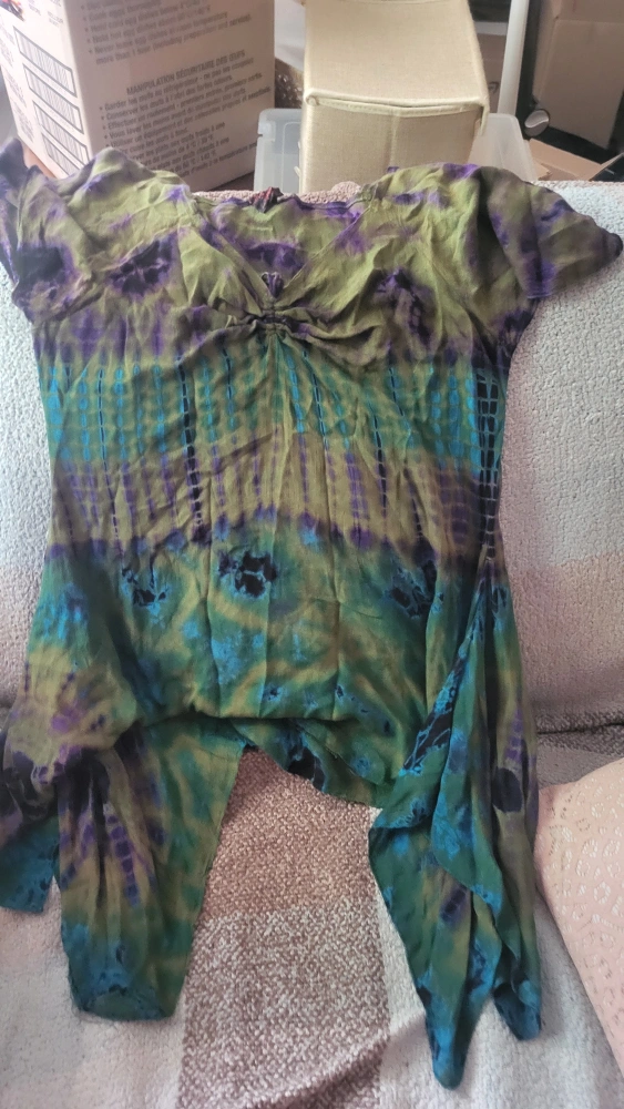 Flowy tie dye tunic top in shades of green, blue, and purple. It's in good condition and ready for a new home!