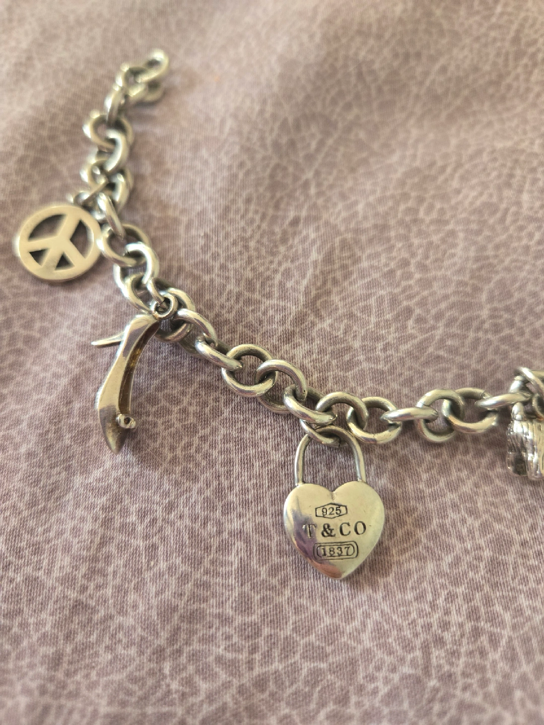 Selling a vintage Tiffany & Co. charm bracelet! It features a variety of cute charms, including a heart-shaped lock with the Tiffany & Co. logo and the year 1837. A stylish addition to any jewelry collection! 30.5 g weight