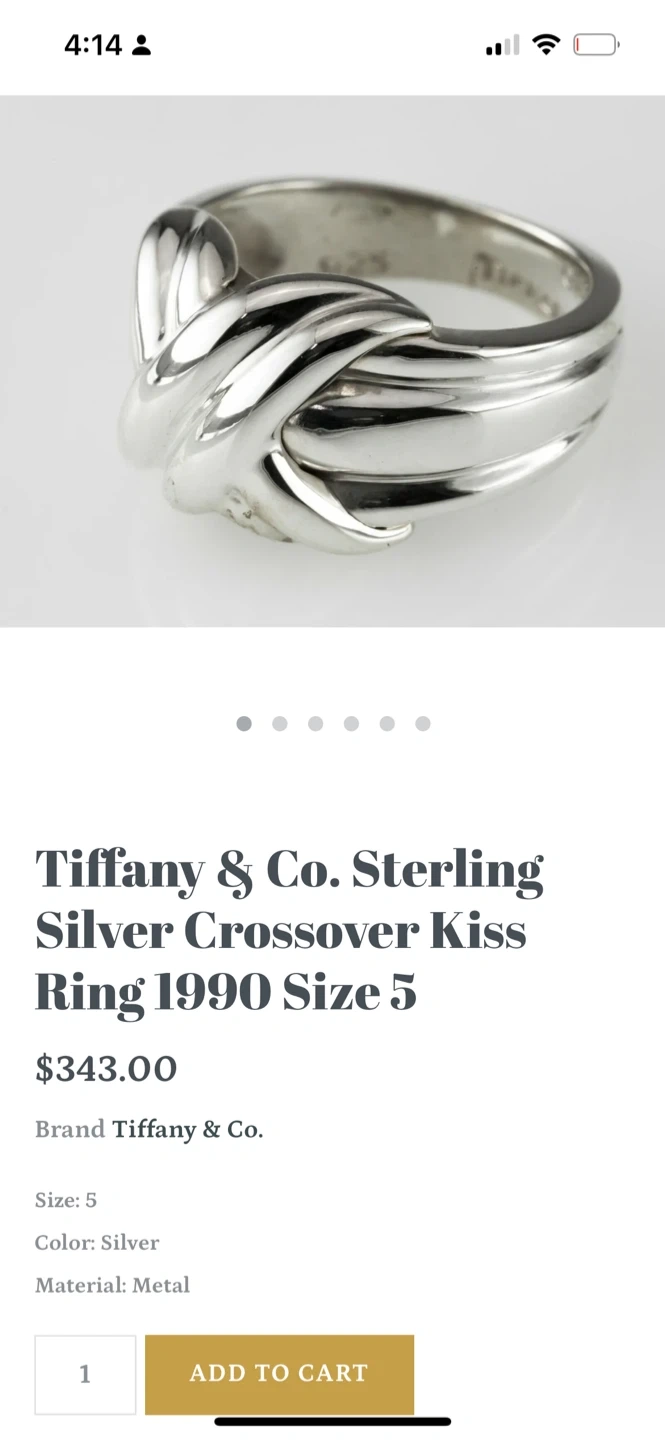 Selling a Tiffany & Co. Sterling Silver Crossover Kiss Ring from 1990. It's a size 5 and made of sterling silver, with a distinctive crossover or X-shaped knot design. The ring is typically stamped with "Tiffany & Co." and "925" on the inside band, indicating it is made of sterling silver