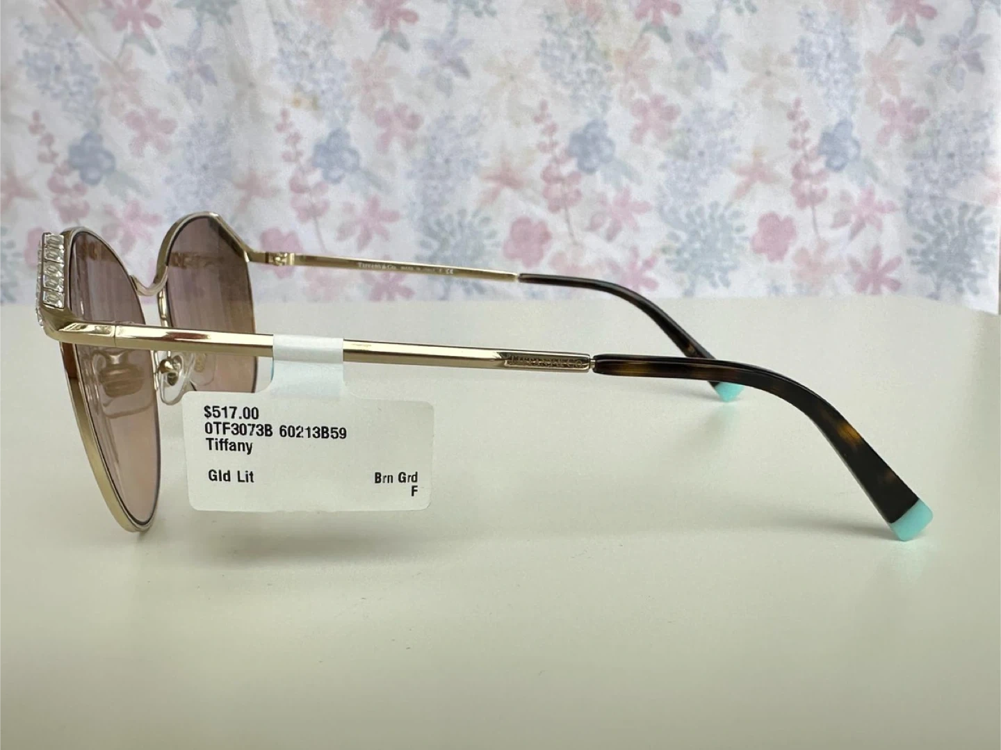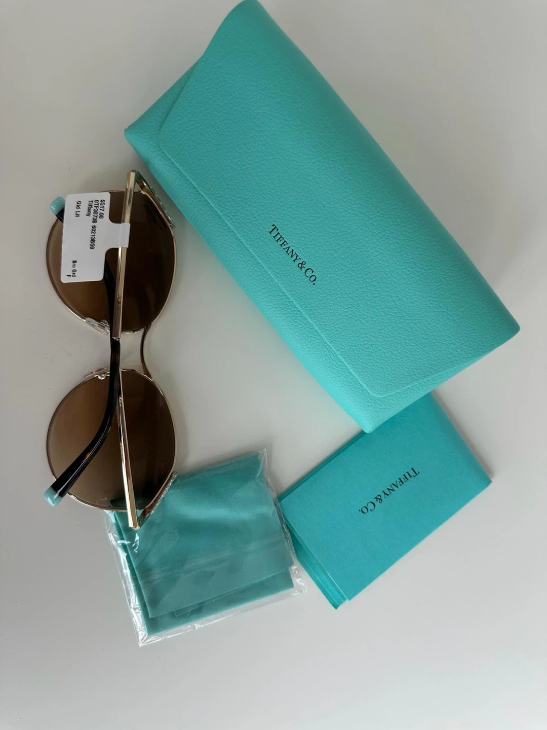 Selling a stylish pair of Tiffany & Co. sunglasses in a gold and brown colour combination. These sunglasses are in great condition and come with their original case and cleaning cloth. The original price was $517.00, according to the tag. A fashionable accessory to complete any outfit!