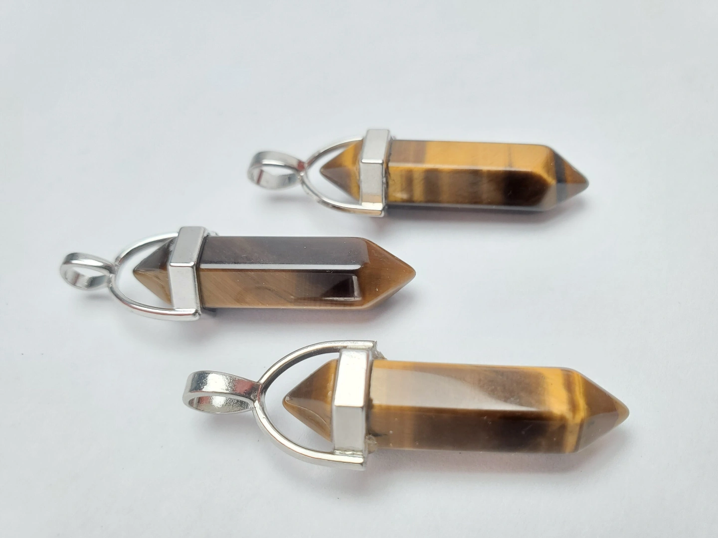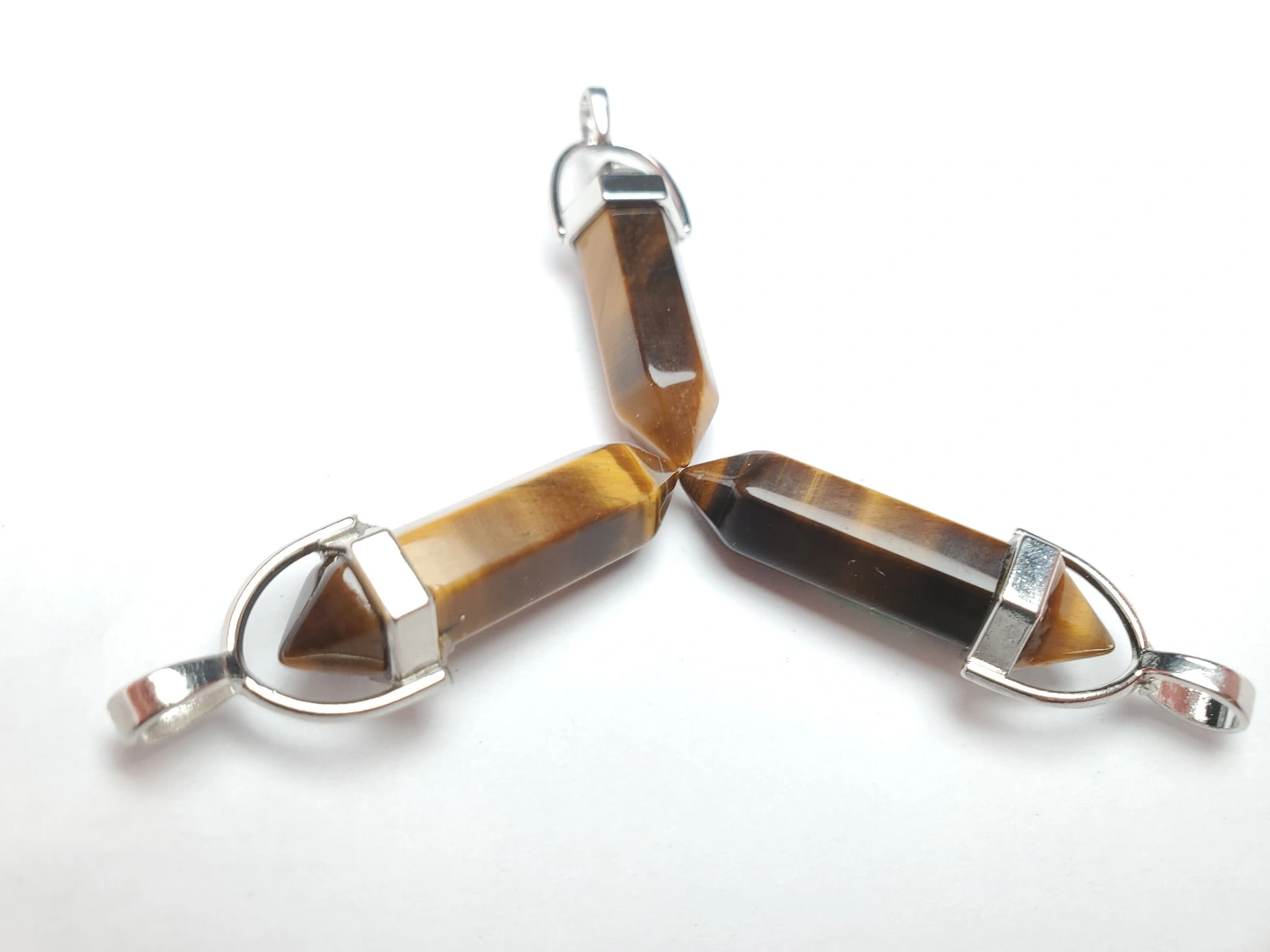 Gold Tiger's Eye Hexagon Pointed Pendant. New. $5 pendant only $7 pendant with Leather chain $10 pendant with 45 cm Stainless Steel Chain Tiger's eye is a stone of courage, energy, willpower, confidence and protection. The setting has zinc alloy, with the option of a 45 cm chain/1.5 mm width, either stainless steel lobster clasp or waxed leather with alloy lobster clasp, or just the pendant. pick up near cawthra and lakeshore, mississauga. can mail for additional cost..