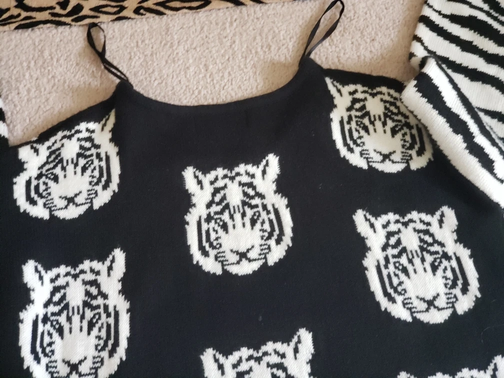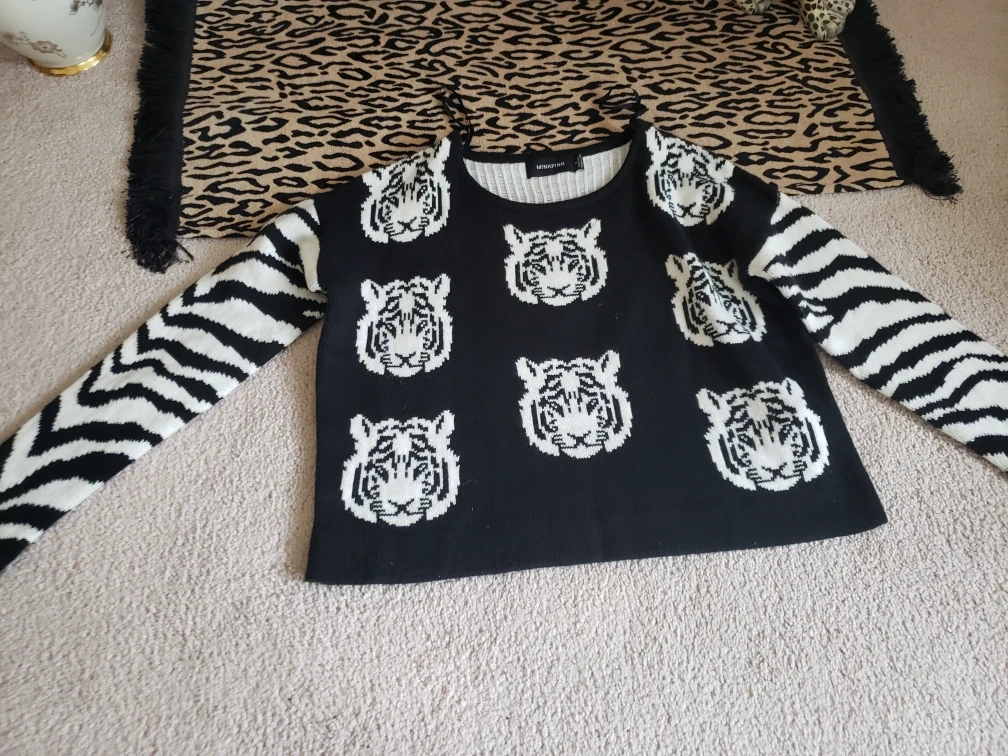 Black and white sweater with tiger print. Sleeves are black and white tiger stripes and full length. inside out, it's reverse pattern, kind of cool! Warm wool sweater for the cold weather and definitely noticable different piece.