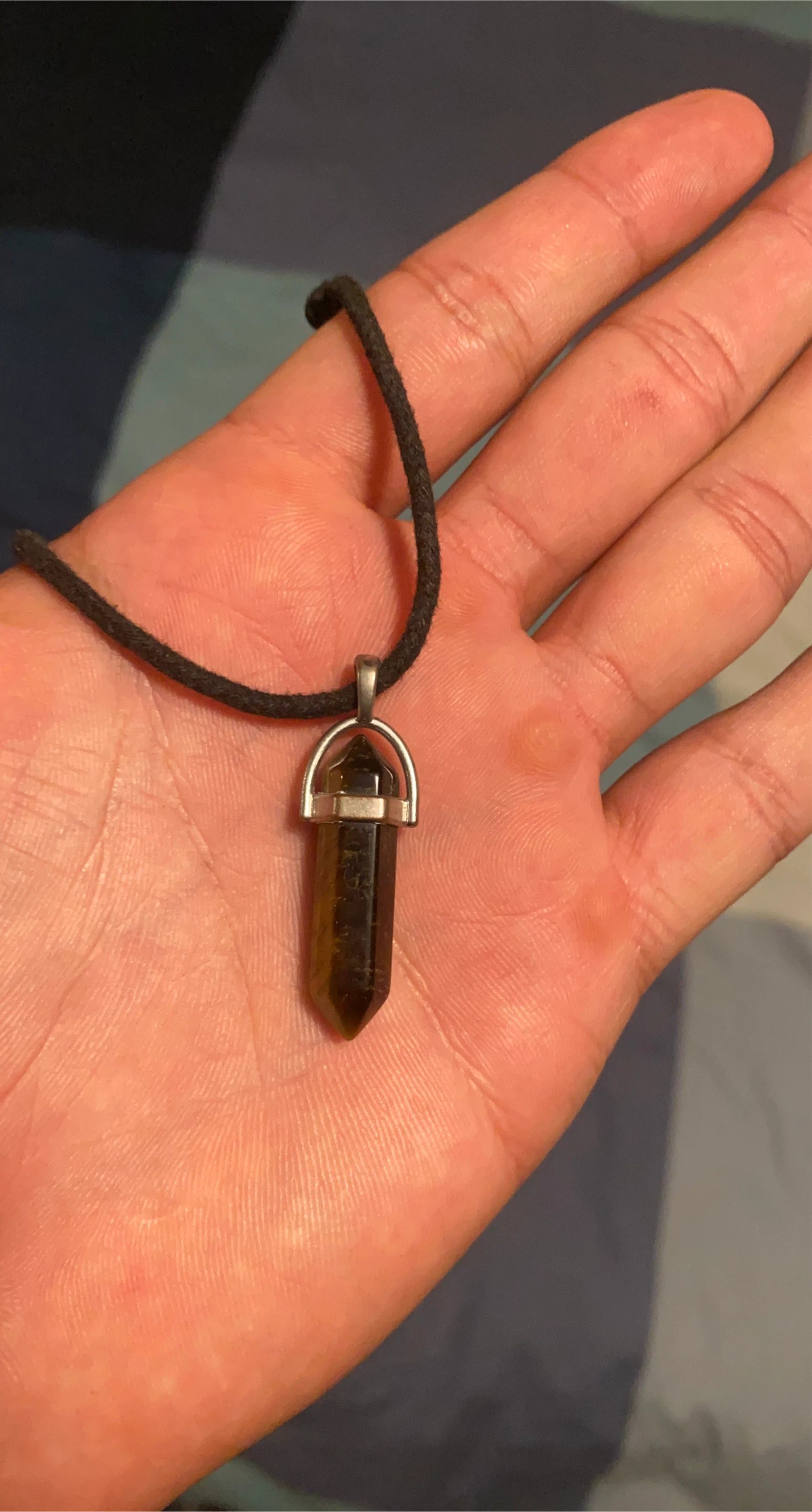 Selling a tiger's eye crystal necklace with a dark brown cord. It's in great condition and I have hase any problems with it, hade it for 3years.